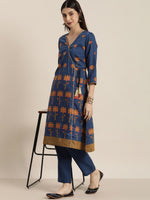 All About You Women Blue Floral Printed Angrakha Kurta with Trousers - XS