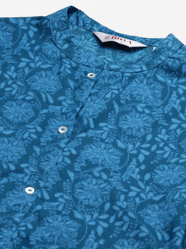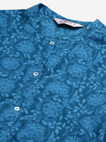 Blue printed straight knee length kurta, has a mandarin collar, three-quarter sleeves, two pockets, curved hem, and multiple slits