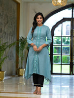 Sky Blue thread-embroidered cotton asymmetrical kurta with button closure. Panelled design with a Calf-length fit-and-flare silhouette, asymmetrical hem, mandarin collar, and three-quarter regular sleeves for a modern, elegant look.