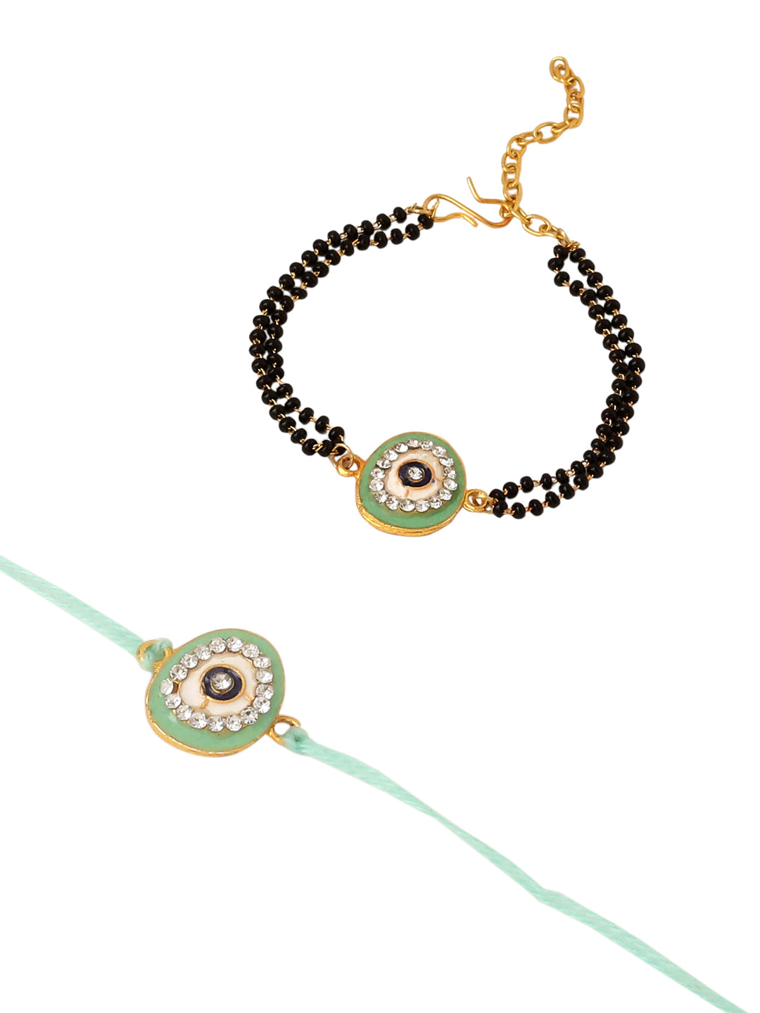 • Style Note: Elevate your Raksha Bandhan celebrations with the elegant NVR Set of 2 Green Round Shape Artificial Stones Bhaiya Bhabhi Rakhi. Featuring beautiful green round artificial stones, this Rakhi set combines traditional charm with a contemporary design. Perfect for your Bhaiya and Bhabhi, it symbolizes love, protection, and blessings. The adjustable thread ensures a comfortable fit for all wrist sizes. Complete Roli, Chawal, Chandan & Mishri perfect for performing the traditional Raksha Bandhan rituals. A thoughtful and meaningful gift to celebrate the bond of love and togetherness this Raksha Bandhan.