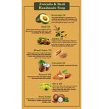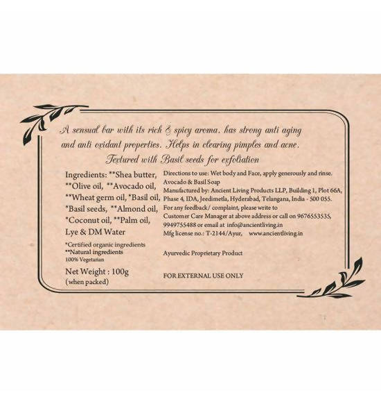 Ancient Living Avocado and Basil Handmade Soap is enriched with avocado oil and natural basil seeds along with other nutrient-rich skin nourishing oils. We bring to you the amalgamation of these heavenly smelling oils which will soothe your skin and bestow a natural glow upon you. This fresh basil soap is handcrafted for you to give you a clearer, glowing complexion. Avocado fruit oil in this soap-making recipe is rich in vitamin E and has a high amount of natural antioxidants that reduces dry, chapped, and dehydrated skin. It even promotes skin elasticity. This avocado soap is textured with natural basil seeds which exfoliate your skin. Basil oil fights blemishes and ensures a clear complexion. This basil soap has a minty, spicy aroma that relieves fatigue and calms your mind. When blended together this avocado recipe forms a perfect combination to give you a wholesome experience.