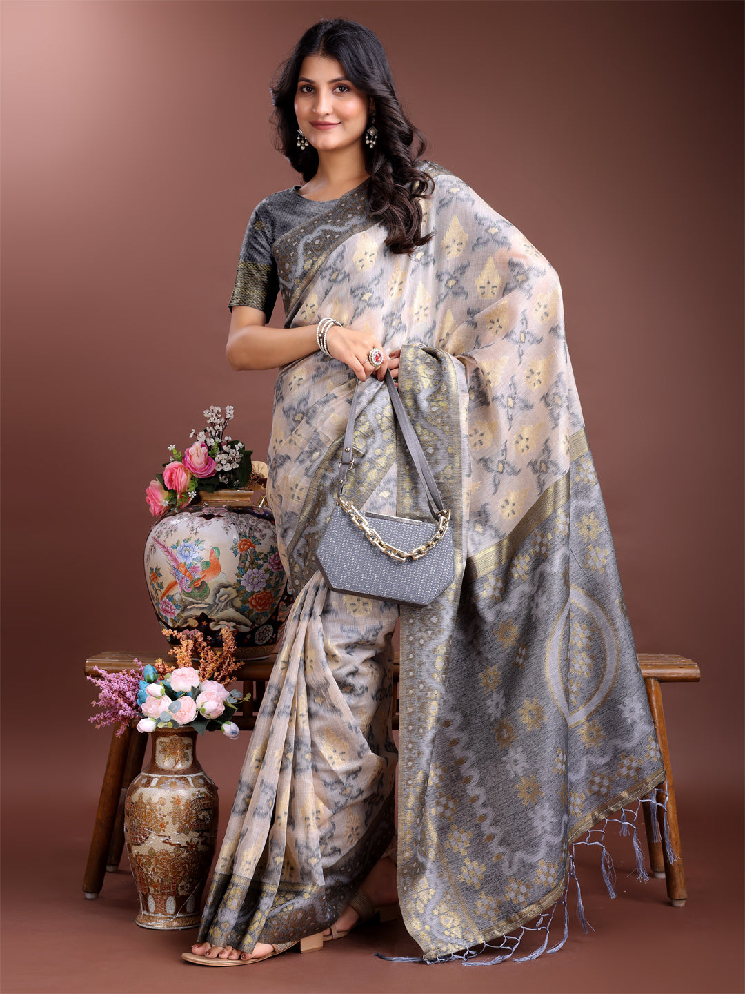 Astita Graceful Beige & Grey Linen Cotton Saree - Lightweight Elegance for Modern Women - Distacart