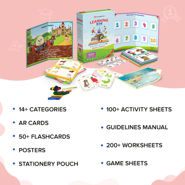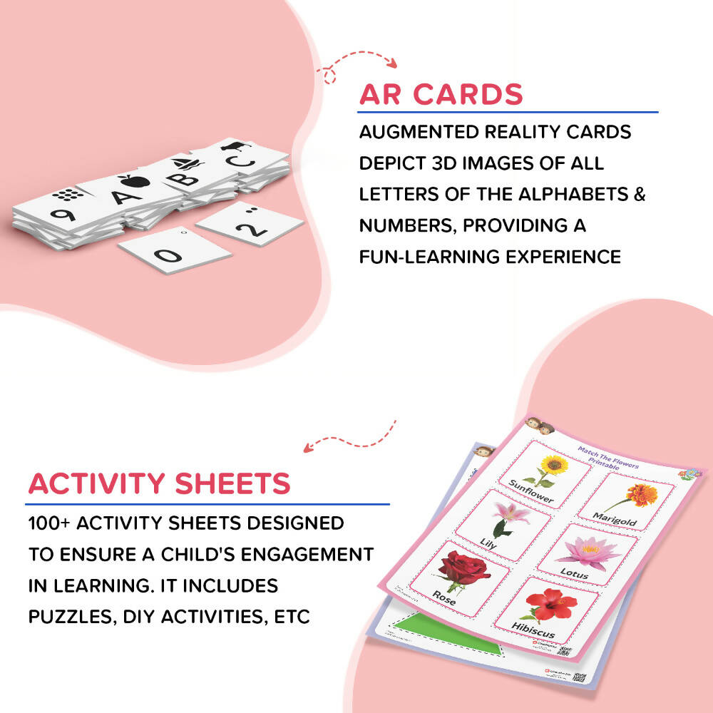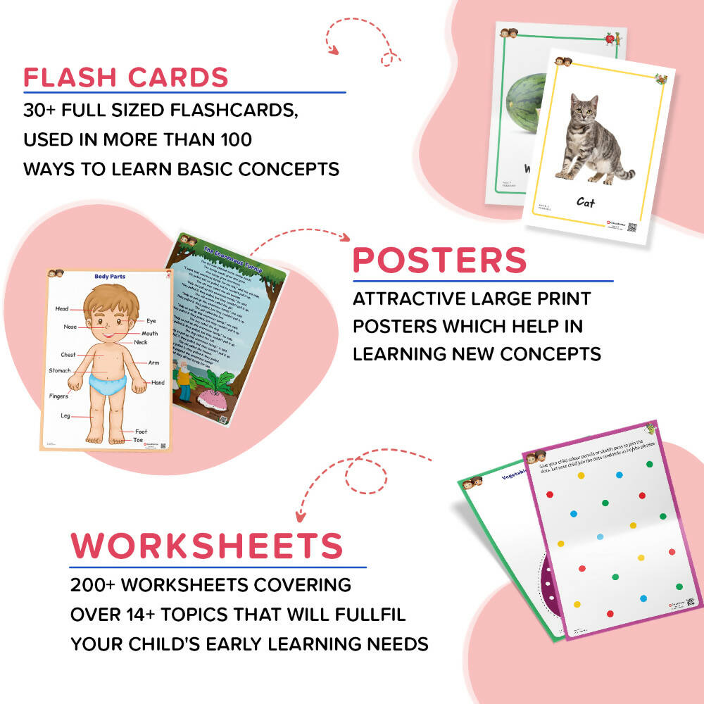 • Alphabets, 1-10 Numbers, Fruits and Vegetables, Basic Shapes and Colors, Transportation, Preschool Rhymes and Preschool Stories for Toddlers, 300+ Worksheets for Playgroups, DIY Activities, Games for Toddlers, Early Learning Flashcards, Brain Activities, Rhymes and Stories for Toddlers, Posters & Stationery Pouch. Keeps children away from the screen for hours through the most easy and most fun way.
