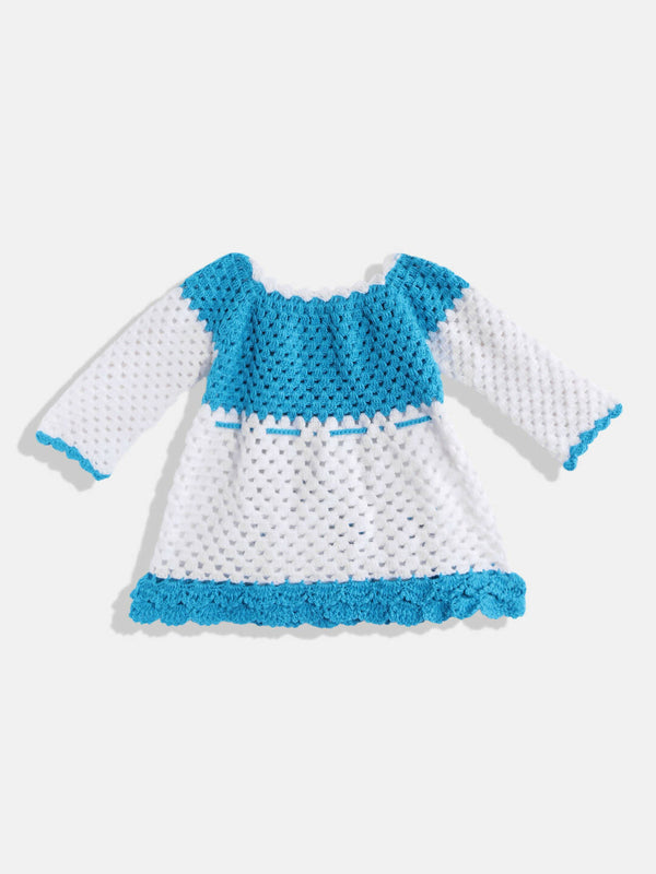 Chutput Kids Woollen Hand Knitted Full Sleeves Rose Work Dress For Baby Girls - White - 0-3 M
