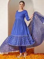 Janasya Dark Cotton Foil Print A-Line Kurta Set