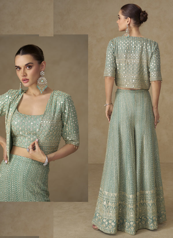 Vegaa Fashion Mint Green Georgette Embroidered & Hand Work Jacket Style Co-Ord Set - 36