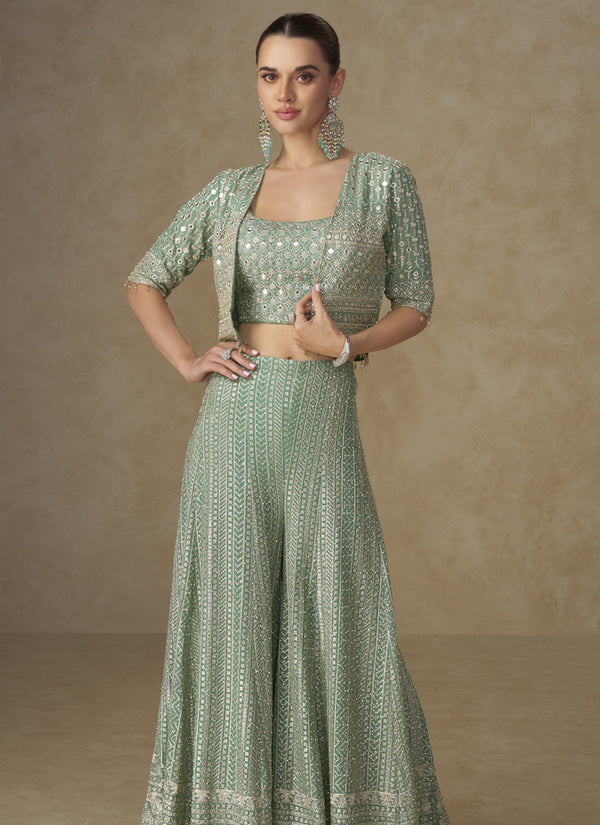 Vegaa Fashion Mint Green Georgette Embroidered & Hand Work Jacket Style Co-Ord Set