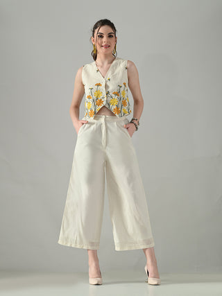 Myshka Women Off White Multicolor Thread Embroidered Co-Ord SetProduct Details: Package Contains : 1 Waistcoat, 1 Trouser Shape: Fit and Flare Fabric : Cotton Color : Off White Work/Pattern : Embroidered Neck Line : Shirt Collar Length : Regular Closure : Zip Wash & Care : Dry Cleaning, Do not BleachLegal Disclaimer : Product color may slightly vary due to photographic lighting sources or your monitor settings.