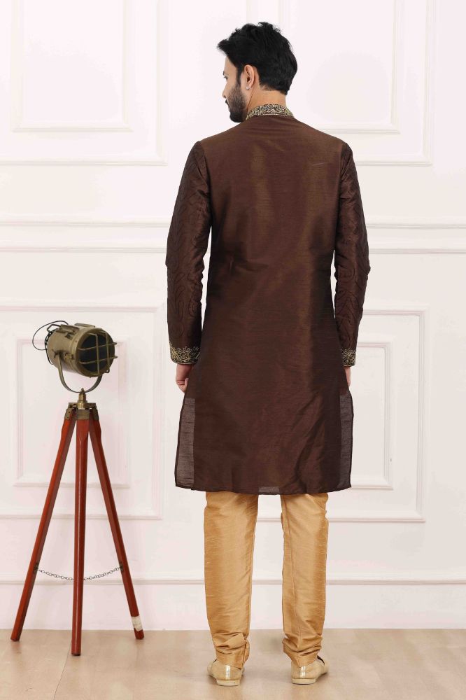 Raivat Ethnic Art Banarasi Silk Thread Work Kurta Pajama In Brown ColourAbout the product:Elevate your ethnic wardrobe with this expertly tailored ...