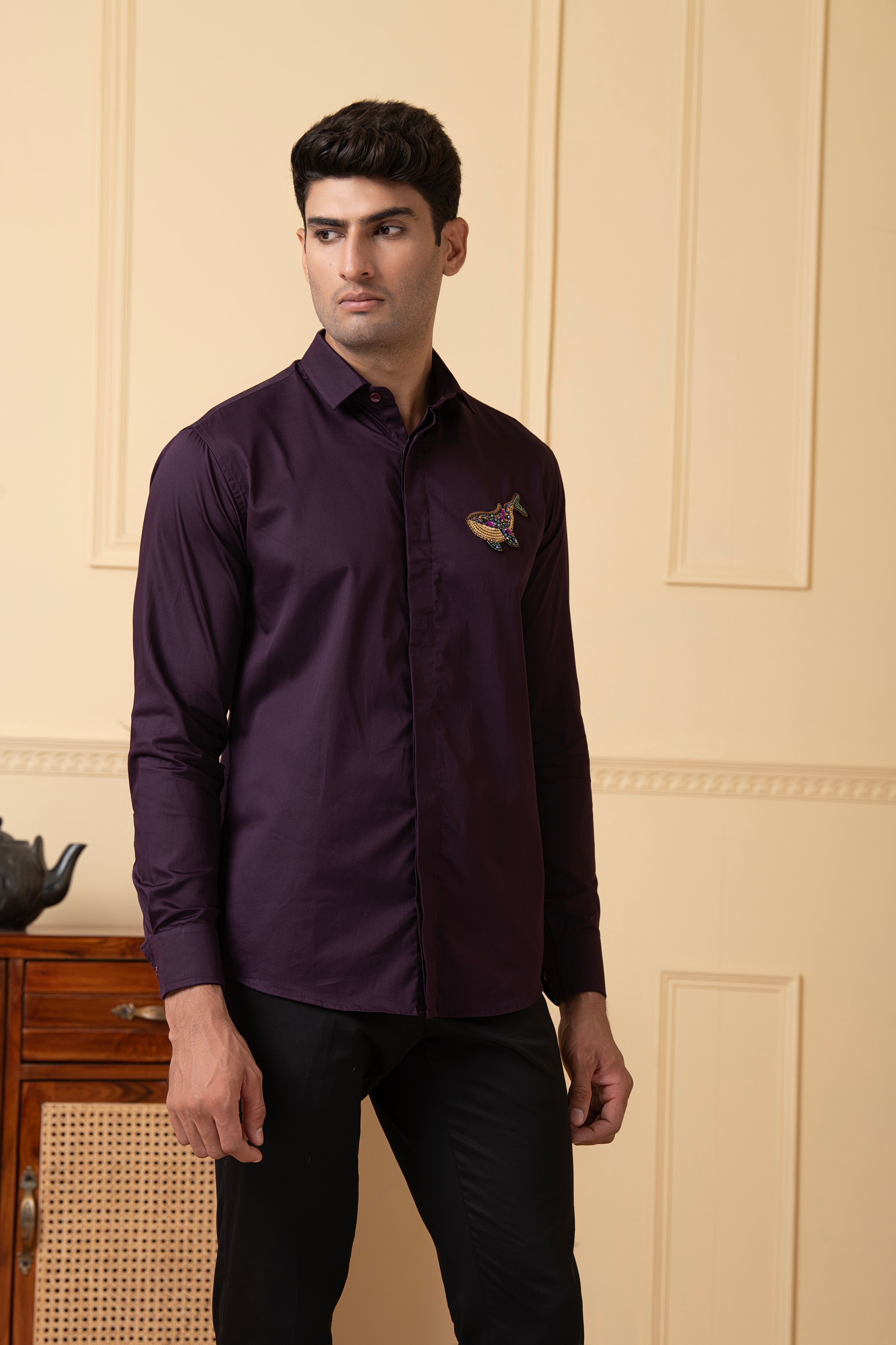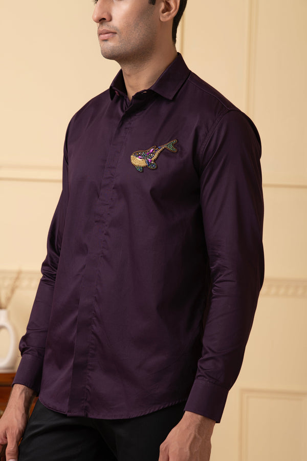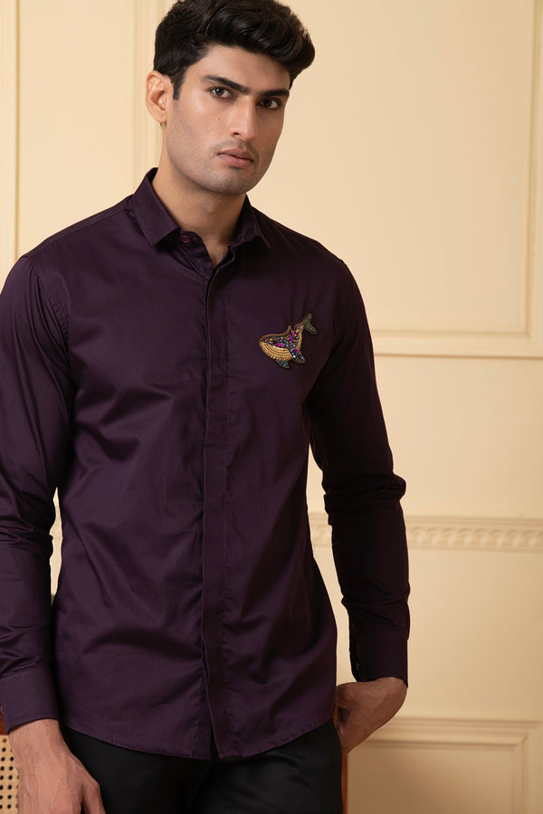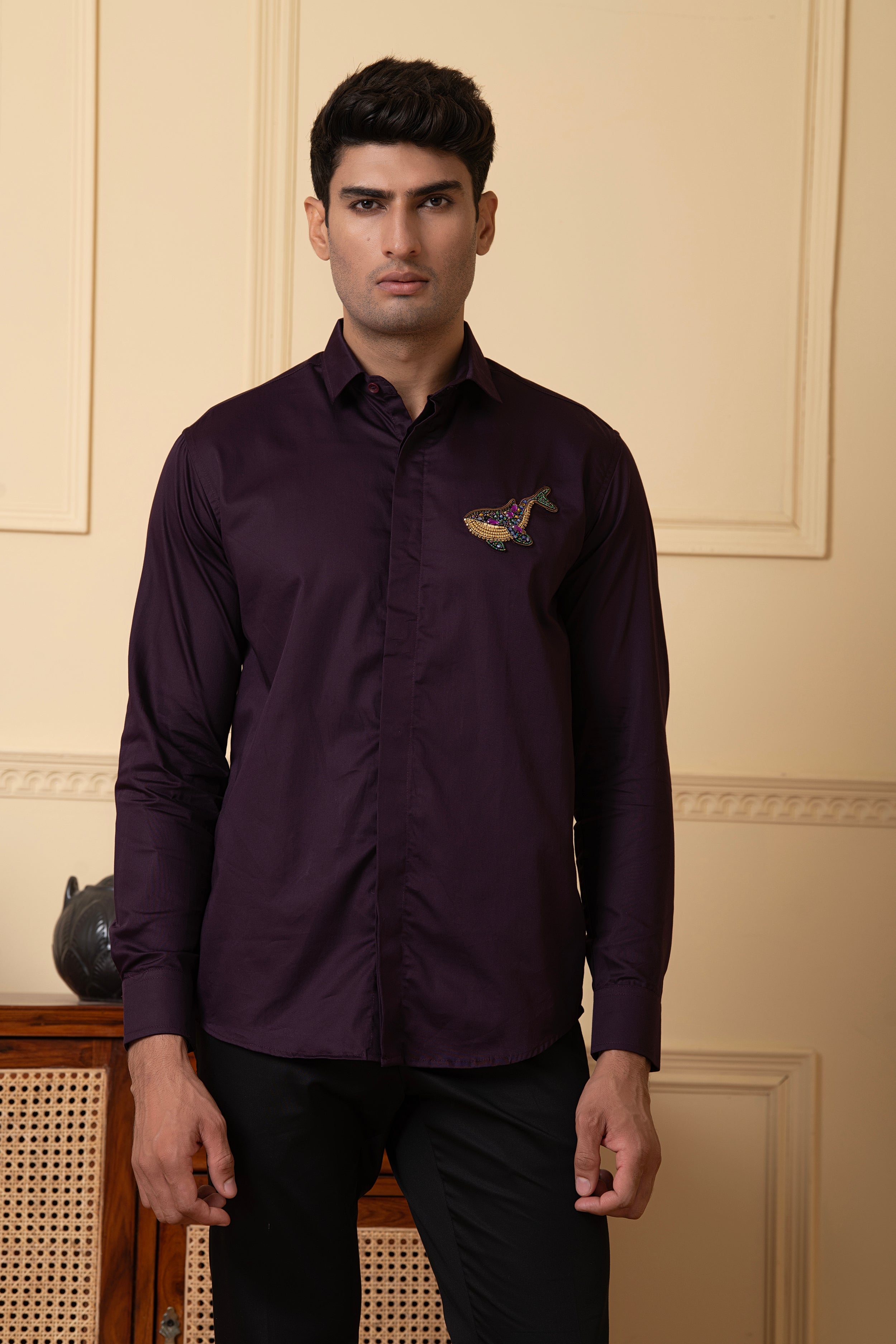 Hand embroidered appliqué of a magnificent blue whale, The intricate beadwork adds a touch of elegance, making each piece unique. Designed with concealed buttons, the Marino shirt offers both style and functionality. perfect for those who appreciate the finer details. Experience the allure of the deep blue sea and impeccable design in one remarkable garment.