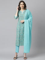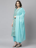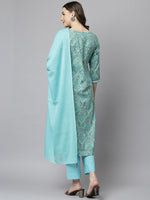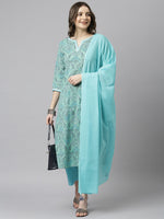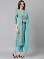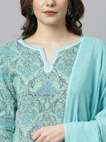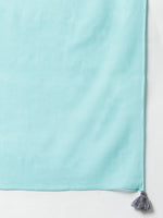 Janasya brings for you the best sea green kurta set for your wardrobe which is apt for every occasion. This set features straight fit, round neckline which has a delicate lacework and 3/4th sleeve with lace at the hem of the sleeve. It comes along with solid pant and dupatta which has cute tassels on each corner of it which emphasises the whole look. Style it up with statement jewellery to complete the look.