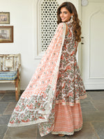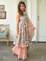 Dress this season with a white and orange floral hand block printed sharara set. The set is crafted in cotton fabric and it features lace work detailing at the hemline, round neckline, with flared silhouette. The sharara has orange chevron prints all over to enhance the look and the dupatta is also designed with lace detailing at the borders.