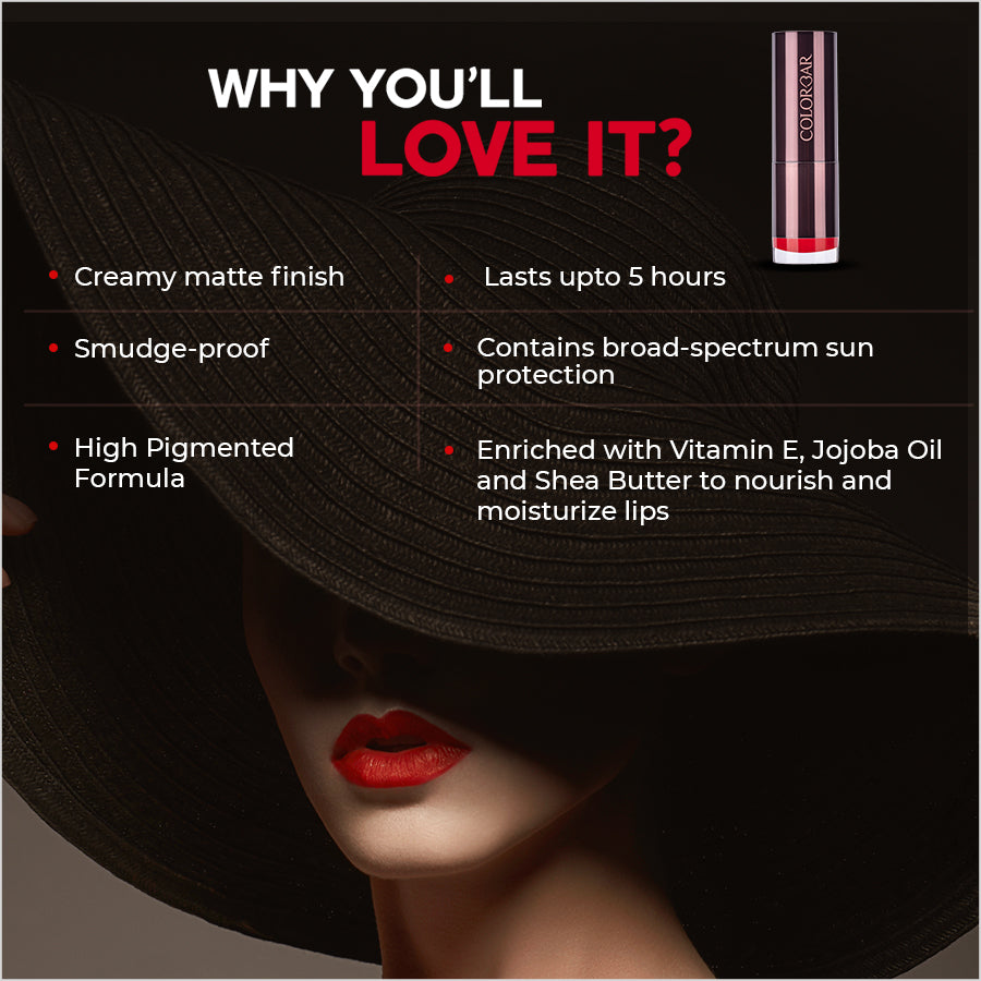 • Infused with softening agents and vitamin e, this lipstick stays on for up to 5 hours so your lips can do all the talking! formulated in India.