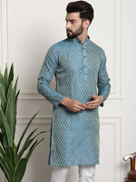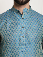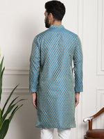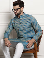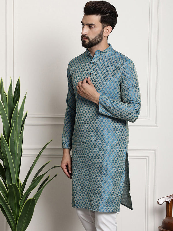 Sojanya Men Blue & Beige Ethnic Motif Printed Jacquard Silk Kurta