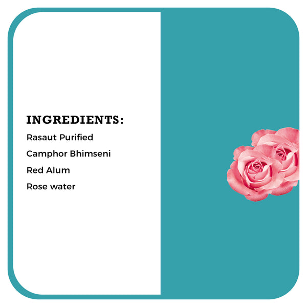 Key Ingredients- Rasaut Purified, Camphor Bhimseni, Red Alum, Rosewater