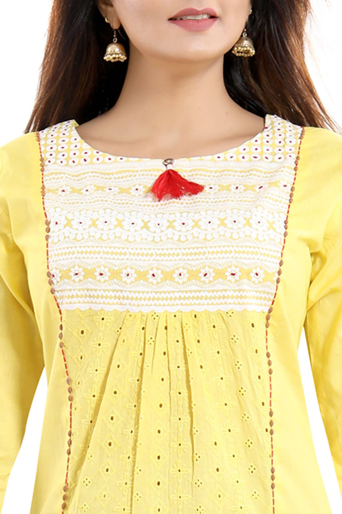 Embrace new cuts and silhouettes with this Vibrant Yellow Cotton Long Chicken Tunic with Pom Pom Accessory For Girls And Women from the house of Snehal Creations. This round neck tunic is made out of cotton fabric that guarantees comfort in all seasons. The body of the tunic features three columns with plain yellow fabric around the sides and yellow chicken fabric making the center panel. The neckline is followed by a wide white chicken panel with subtle threadwork and a red pom accessory. The sleeves of the tunic run three fourth and are plain by nature
