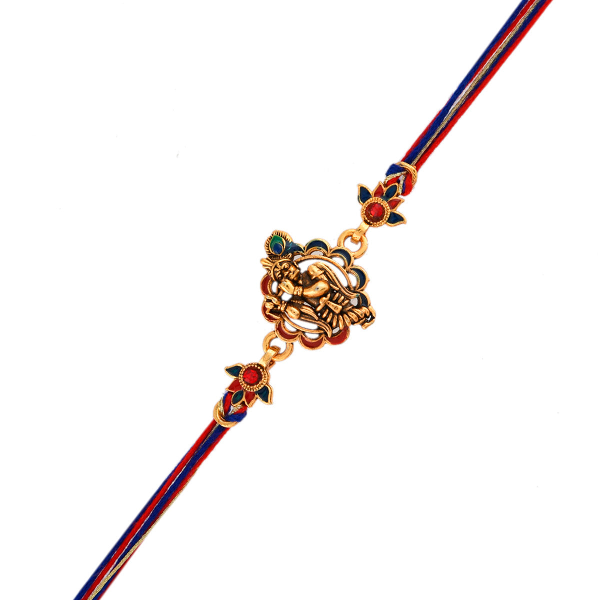 • Colorful thread Rakhi with high polish finish, featuring a Lord Krishna motif. The traditional Rakhi has been designed for style and comfort.