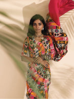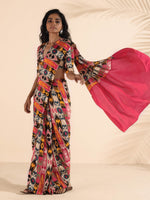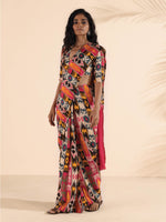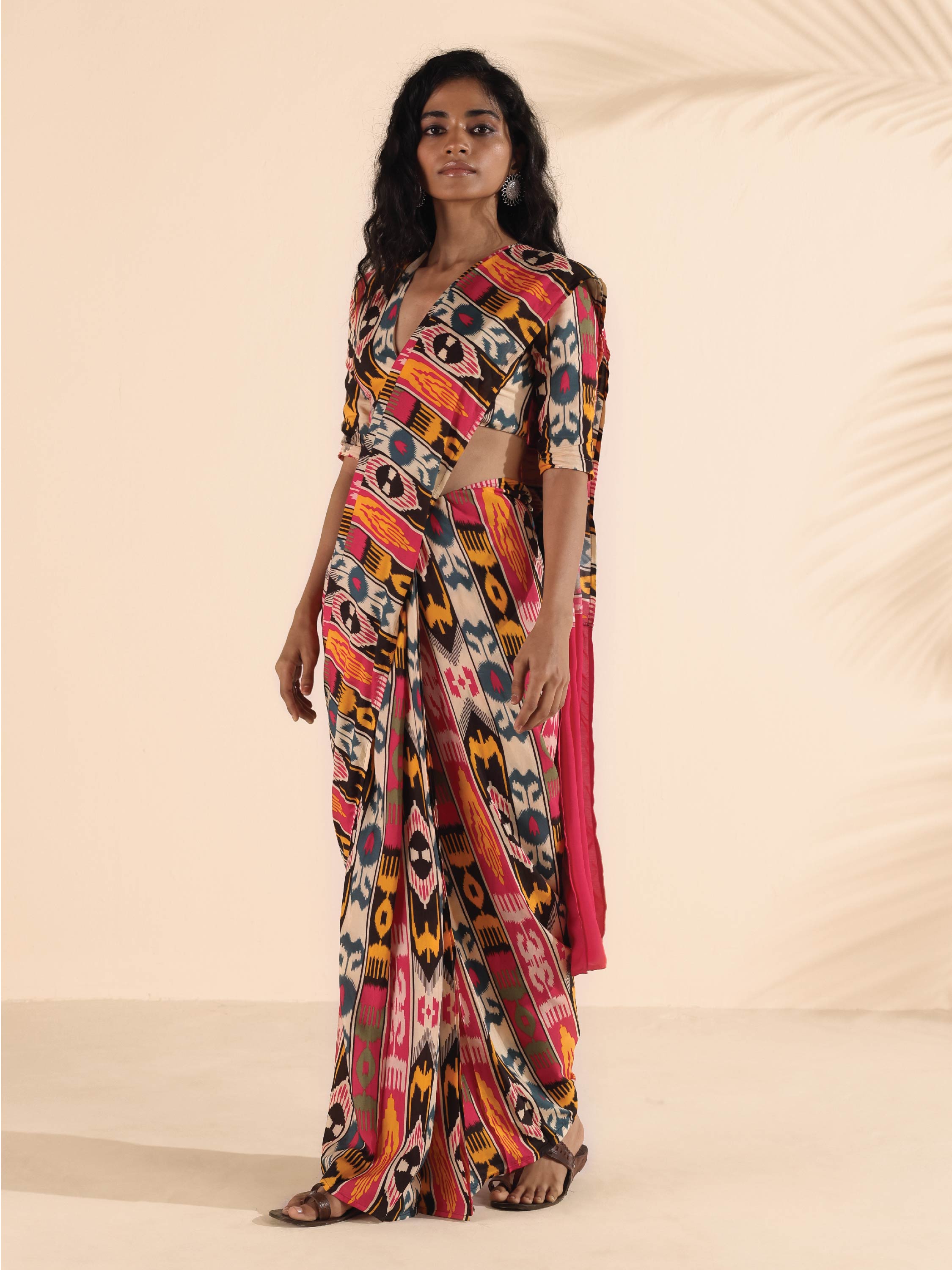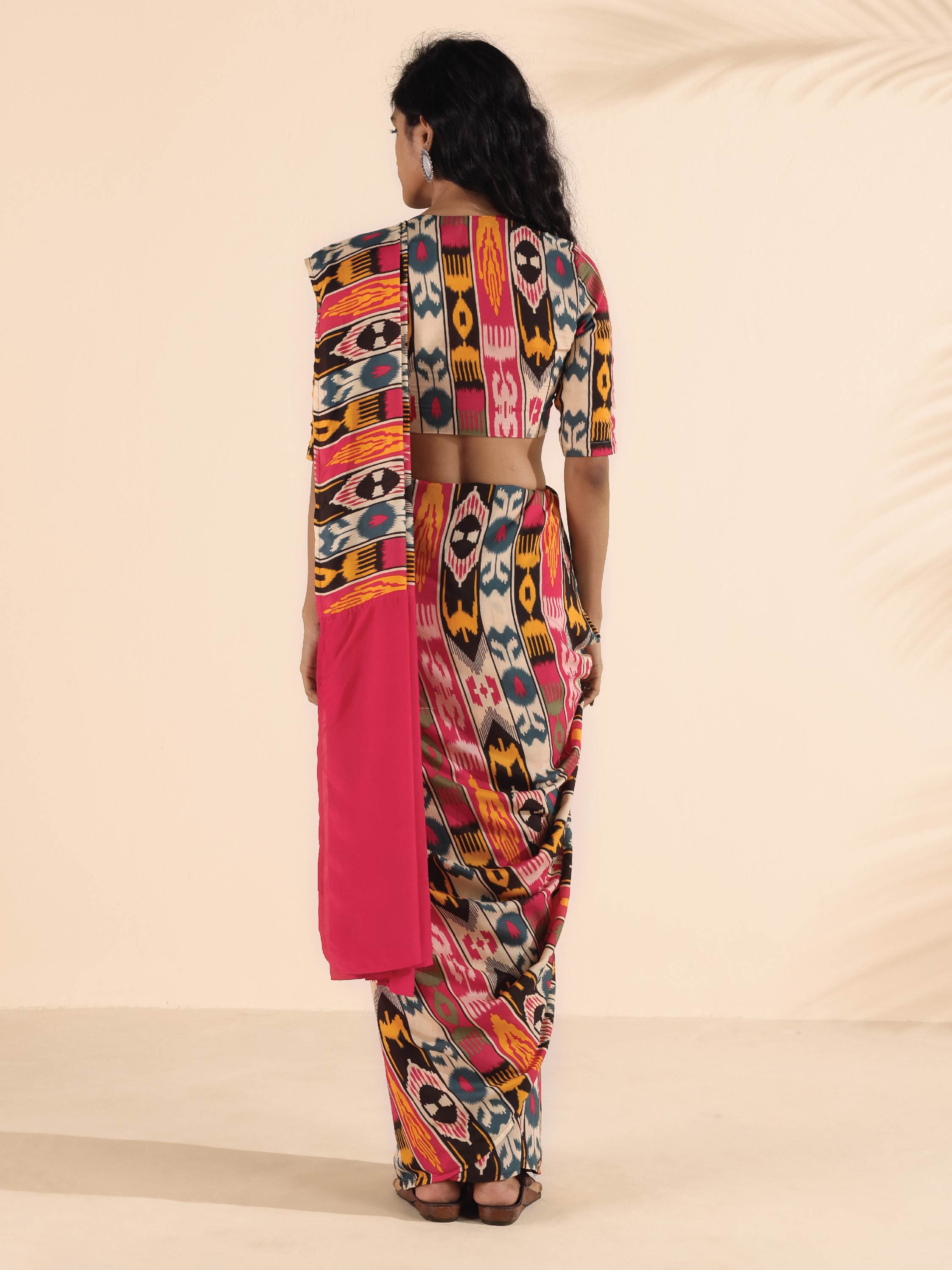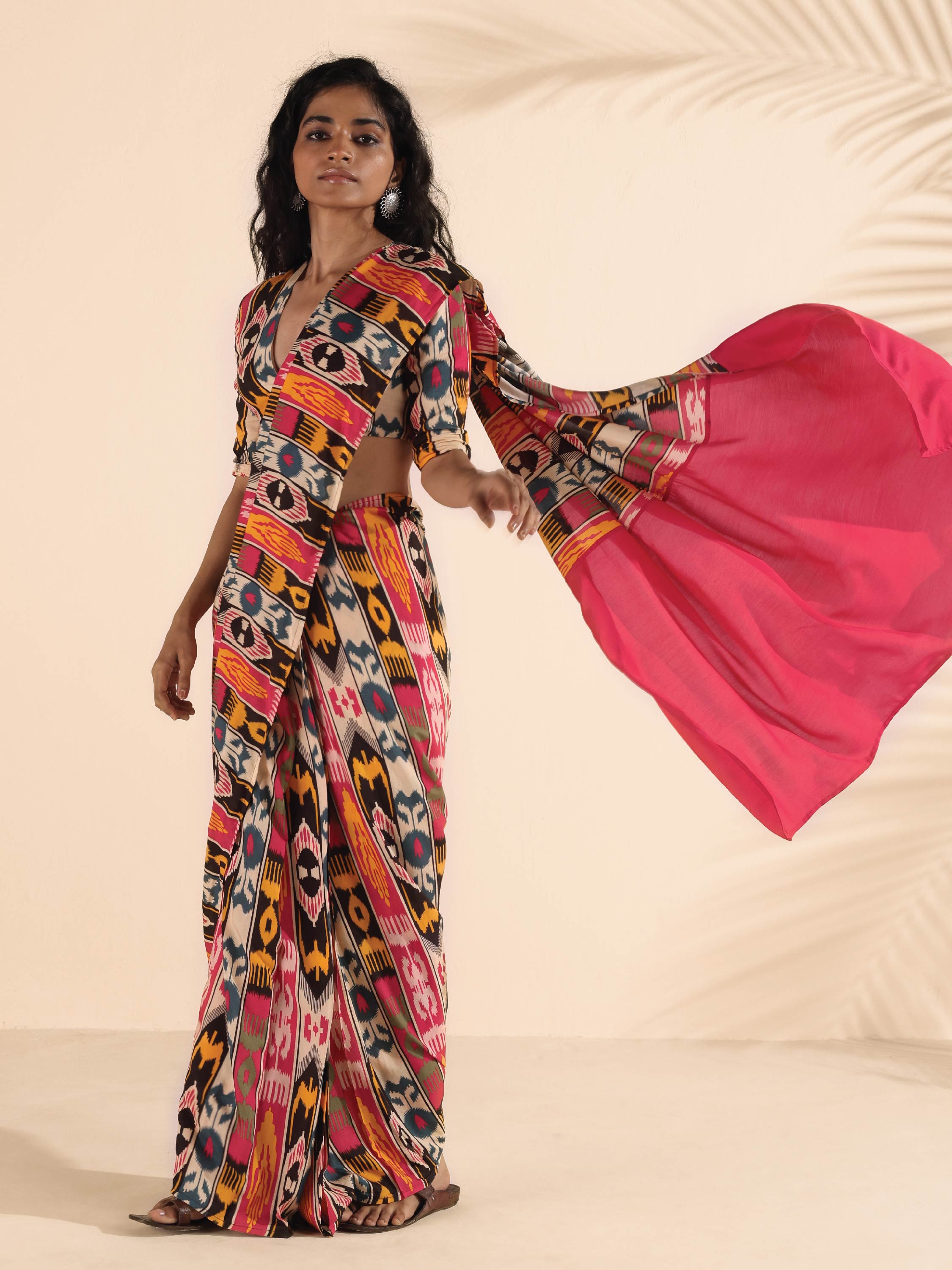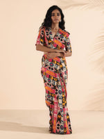 • Muslin Ikat Stripe Printed pre-stitched saree with solid Muslin Silk on pallu detail.