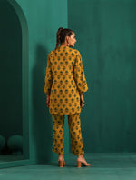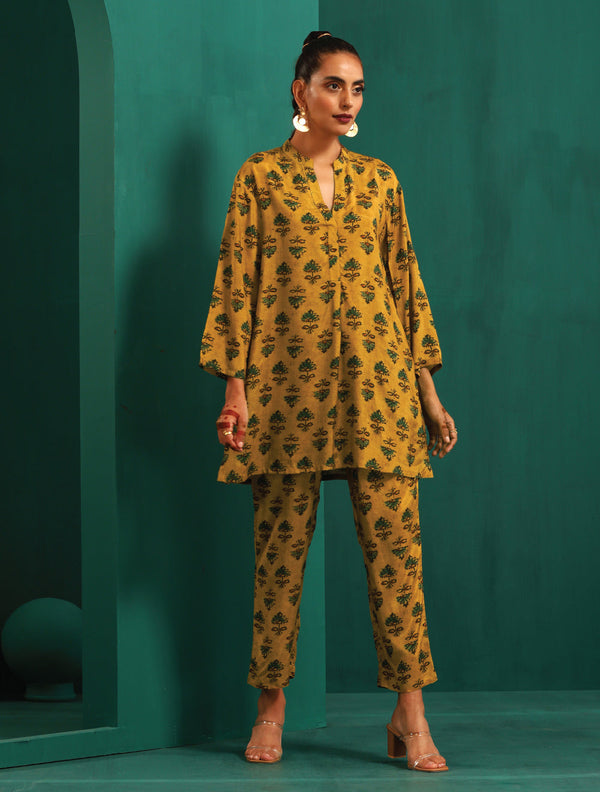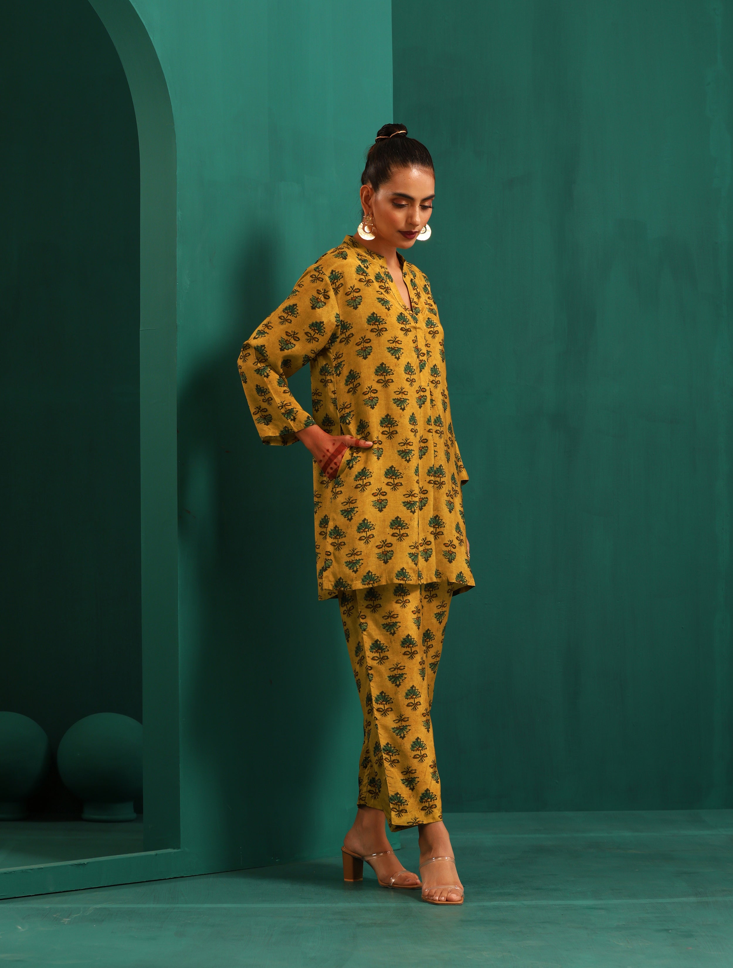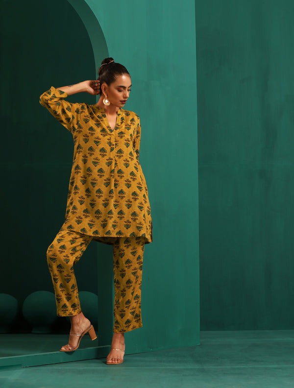 trueBrowns Mustard Flower Stem Muslin Silk Printed Relaxed Co-ord Set