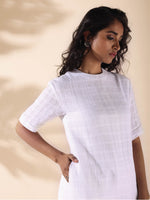 trueBrowns White Cotton Dobby Kurta Pant SetDescription Cotton Dobby Kurta with high low hemline, has half sleeves, round neckline and slit. Paired...