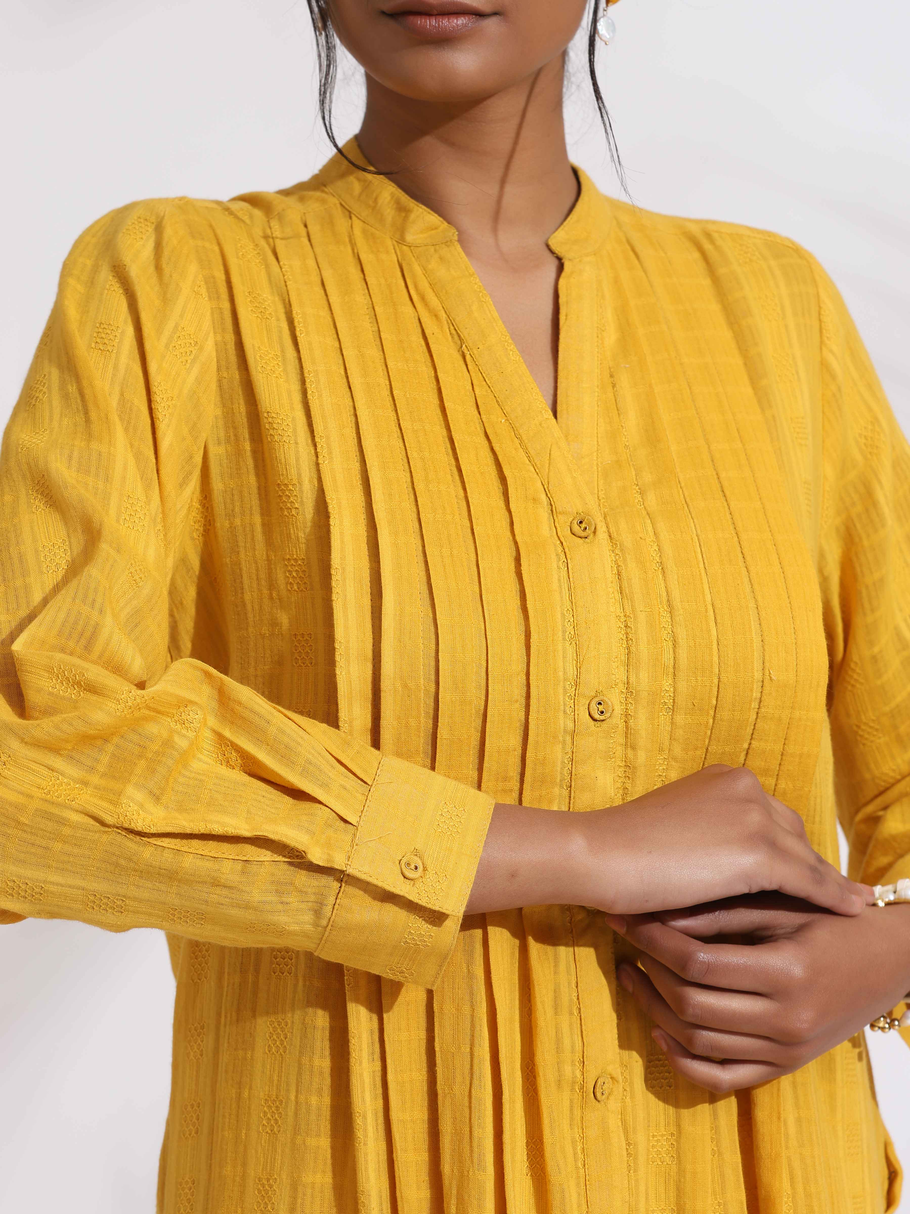 trueBrowns Yellow Cotton Pleated Shirt Kurta Set