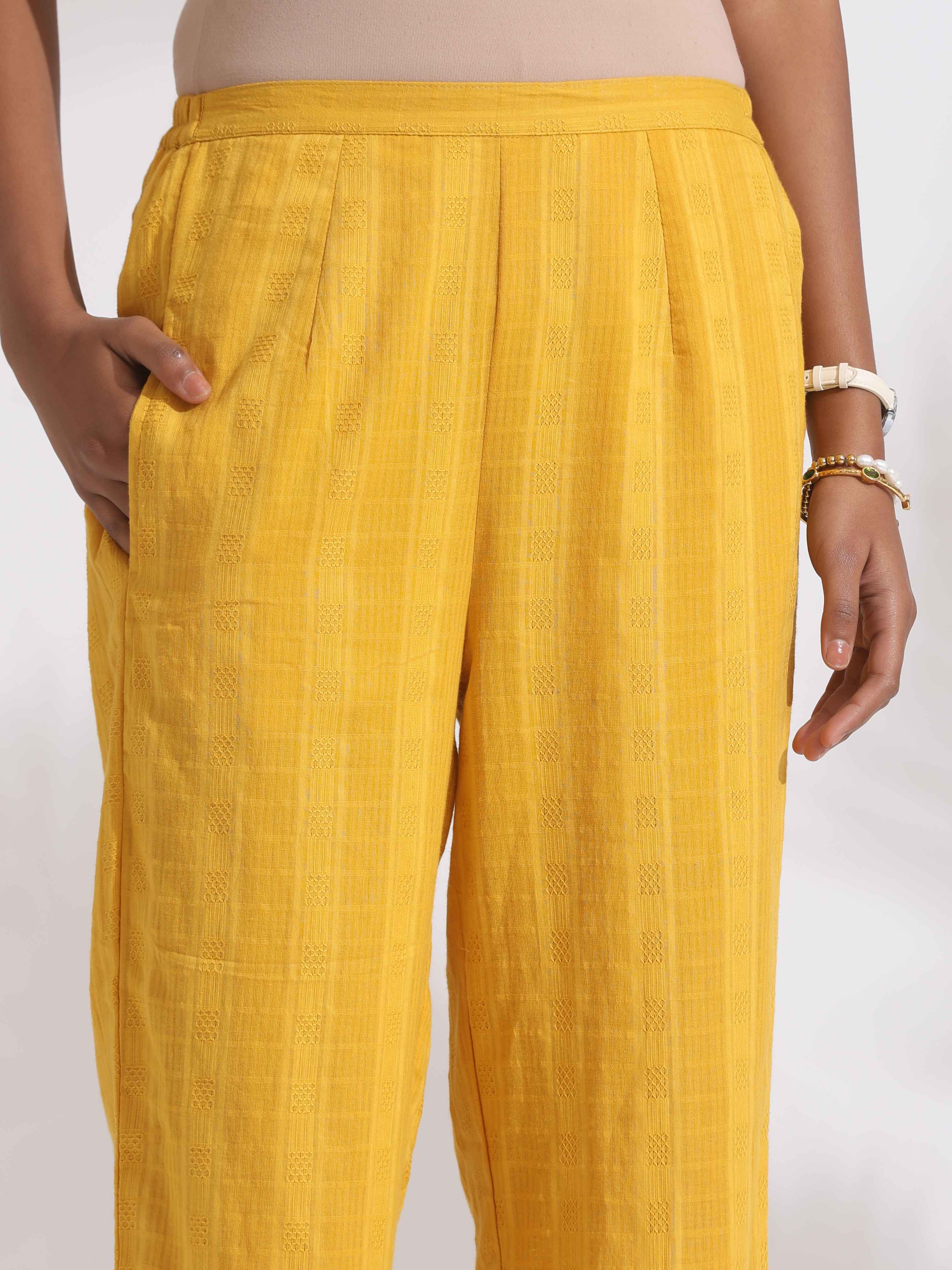 • Elevate your style with this yellow cotton pleated shirt kurta, paired with matching pants.