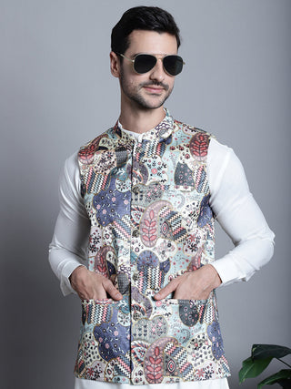 Jompers Men's Printed With Zari Work Nehru Jacket - Blue