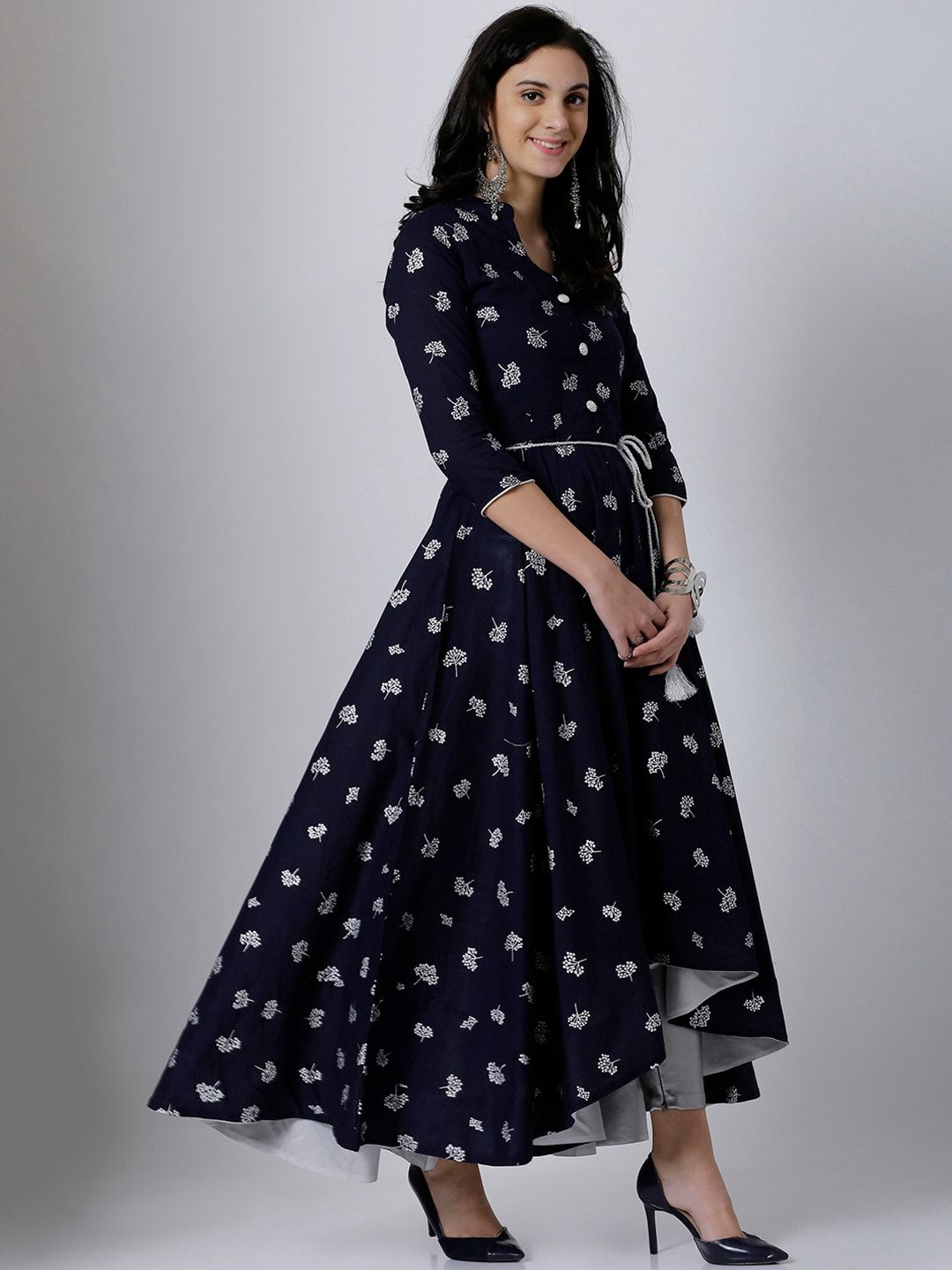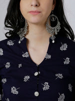 Navy Blue and silver-toned printed anarkali kurta, has a mandarin collar, three-quarter sleeves, flared hem, no slits