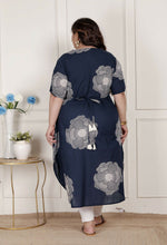 Miravan Womens Plus Size Blue Floral Printed Front Buttoned A-Line Kurta Dress