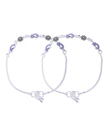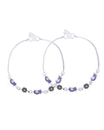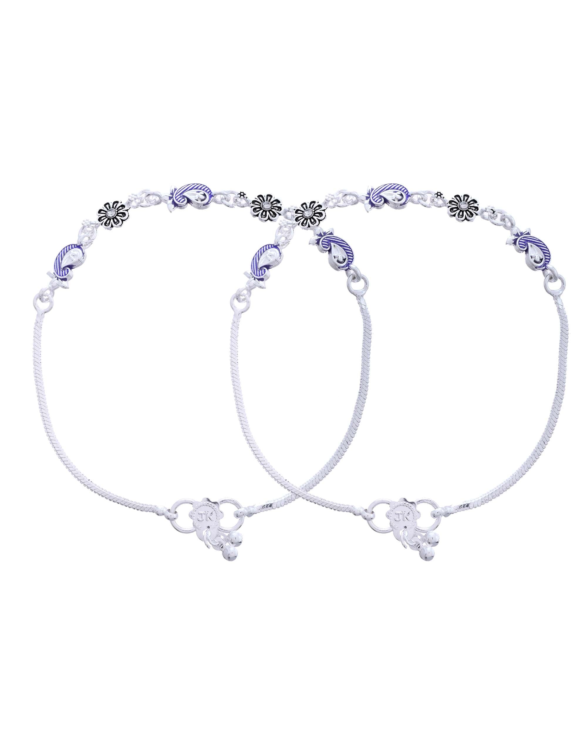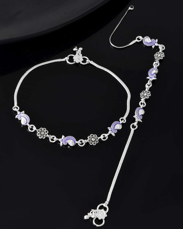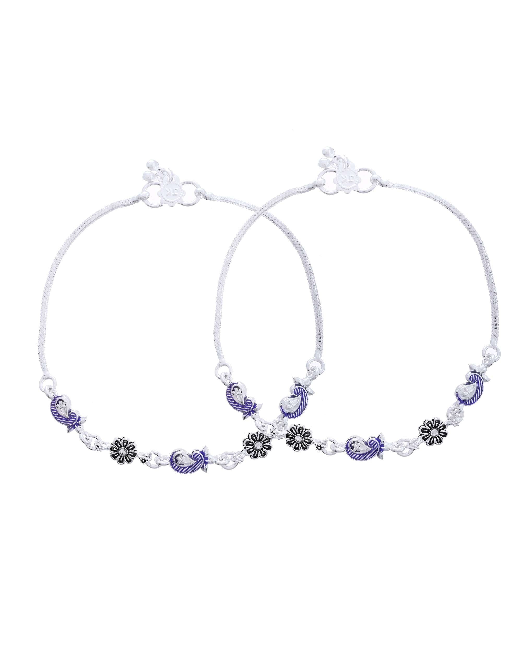Add a splash of artistic elegance to your jewellery collection with this beautifully crafted anklet set. Designed with intricate paisley motifs in a rich purple enamel and complemented by oxidised floral charms, this pair brings together heritage-inspired design and modern aesthetics. The smooth silver-plated stainless steel base ensures long-lasting shine and durability, while the lightweight construction guarantees all-day comfort. Ideal for festive outfits, traditional occasions, or boho-chic styling, this anklet set blends perfectly with both ethnic and western ensembles.