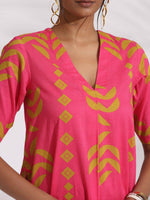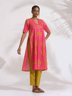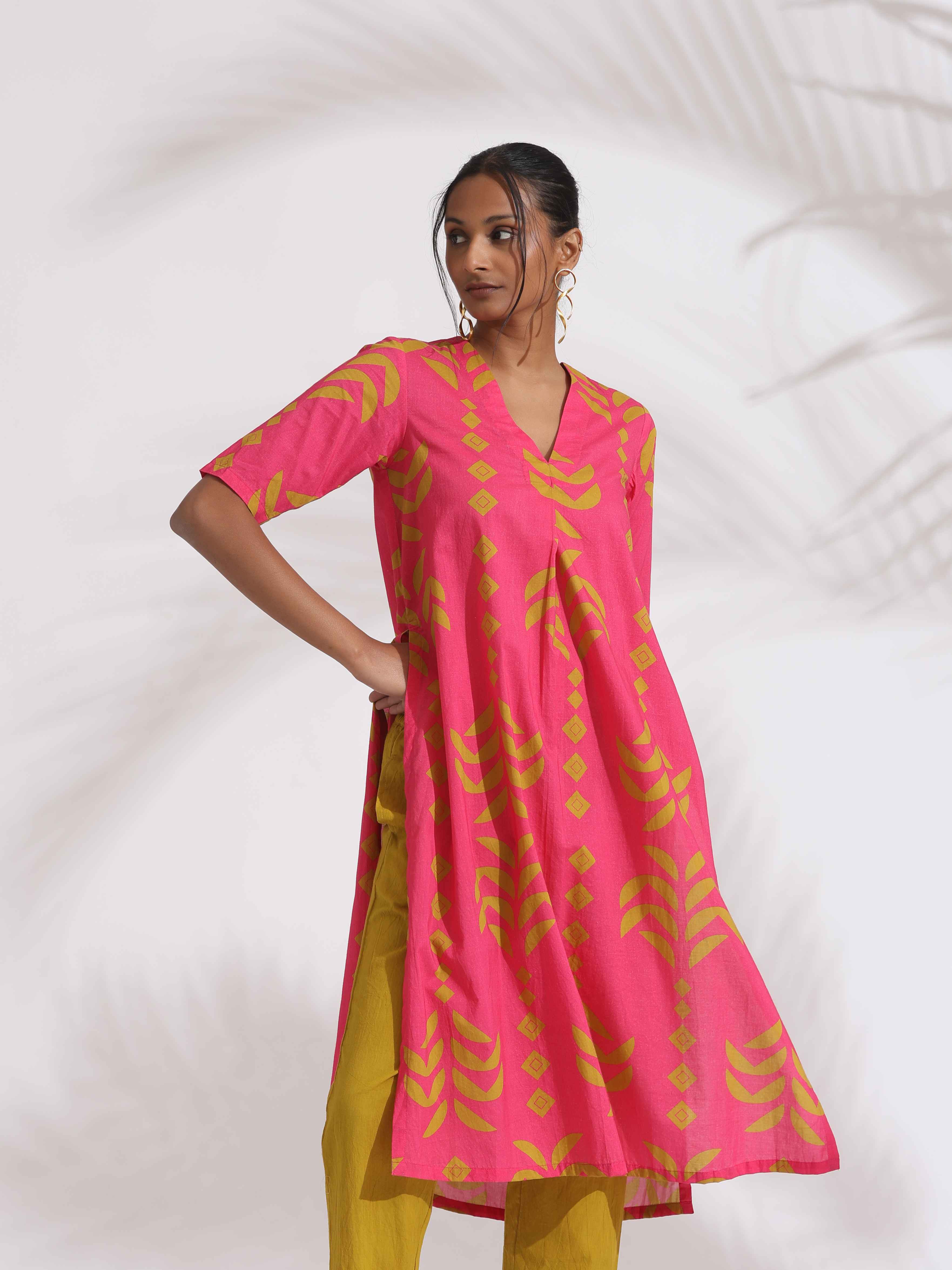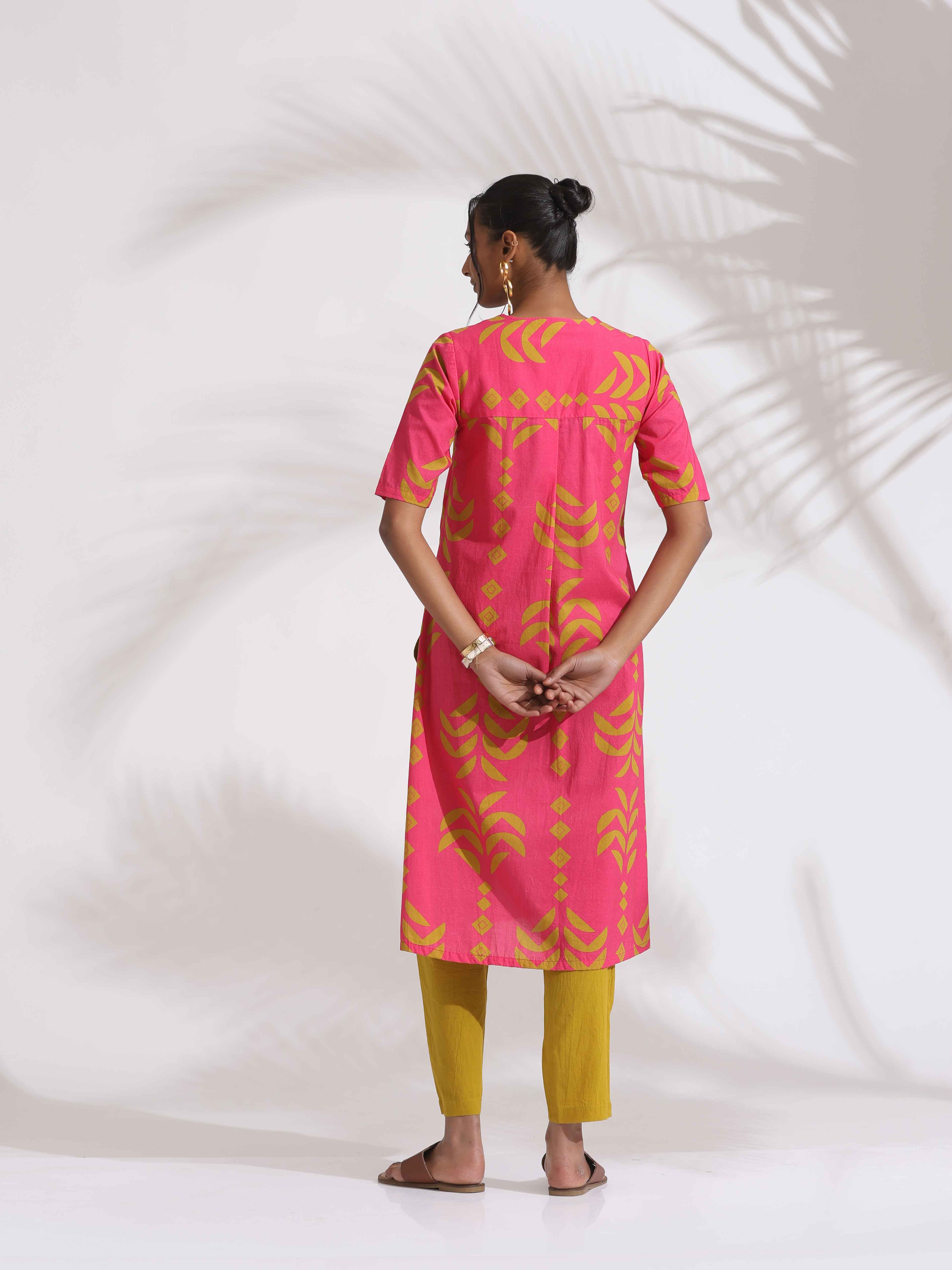 trueBrowns Pink Cotton Print A-line Kurta SetDescription Elevate your style game with this pink cotton printed A-line kurta paired with green cotto...