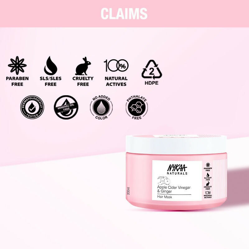 • Nykaa's Apple Cider Vinegar & Ginger Hair Mask is a perfect deep-nourishment formula that combats dandruff and clarifies the scalp. It’s a natural pH balancer and is enriched with vitamins and minerals to contribute to a healthy, build-up free scalp.