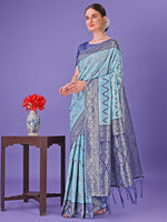 Astita Sky Blue & Green Lichi Silk Saree with Rich Woven Border and Zigzag Pattern - Wedding & Festive WearAdd timeless elegance to your et...