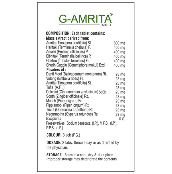 SDH Naturals G-Amrita Tablet is an ayurvedic formulation. It is formulated with natural ingredients like amrita, amlaki, gokshura, and guggulu.