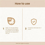 Apply 15 minutes before sun exposure thoroughly on all parts of your baby’s body that are exposed to the sun.