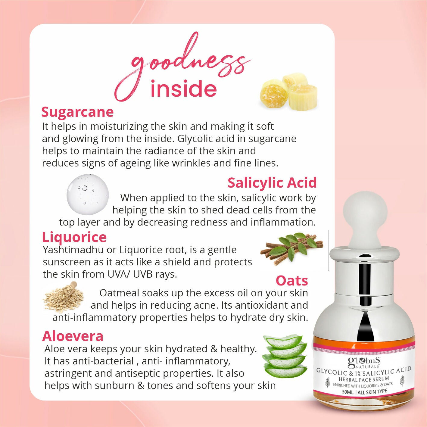 Globus Naturals Glycolic & 1% Salicylic Acid Anti Acne Face SerumGlobus Naturals 1% Salicylic acid Face serum fights acne and acne marks. It he...