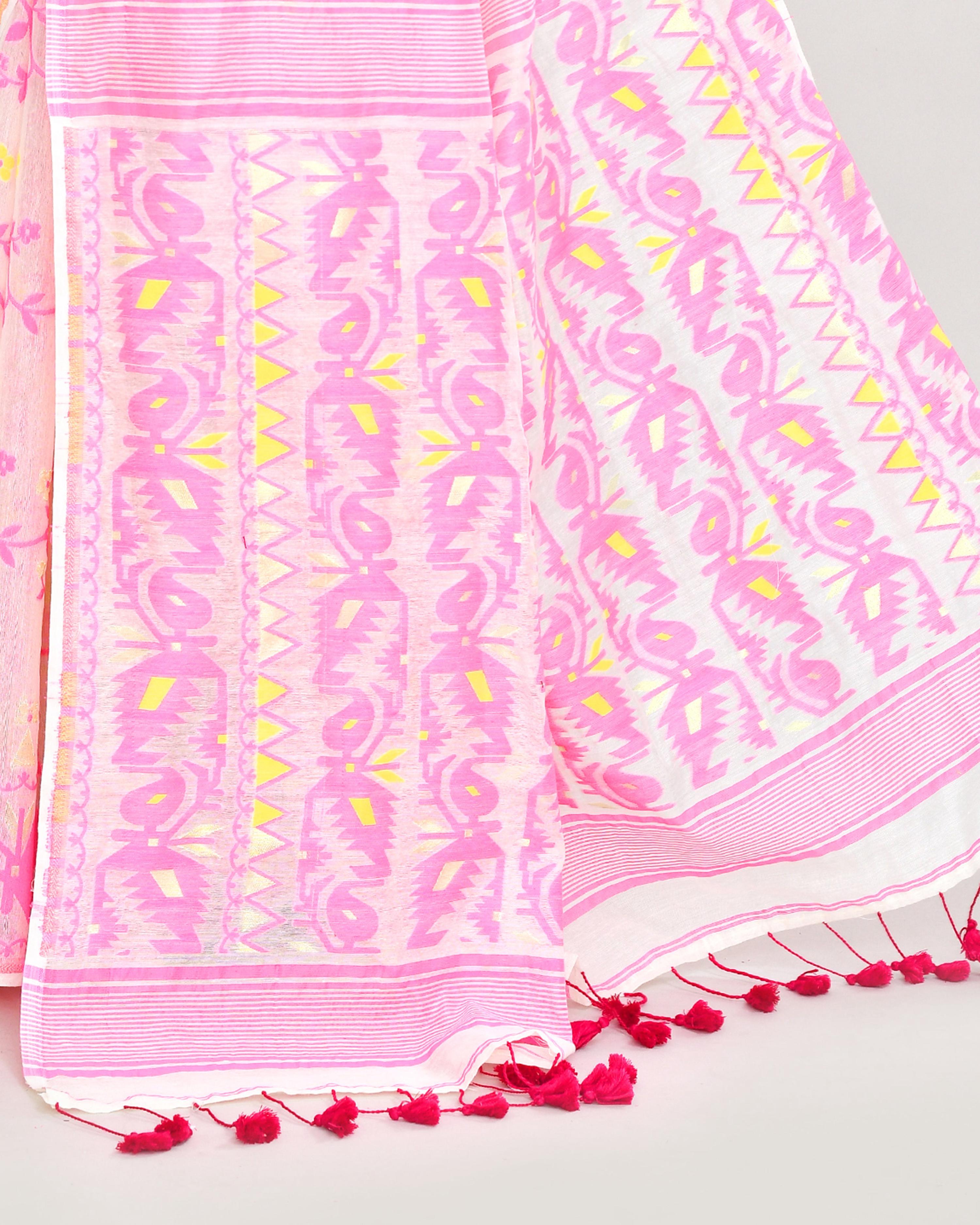 Piyari Fashion Women's Off White Pink Cotton Silk Jamdani Saree