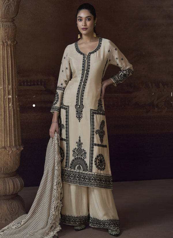 Vegaa Fashion Off White Chinon Silk Embroidered Designer Palazzo Suit