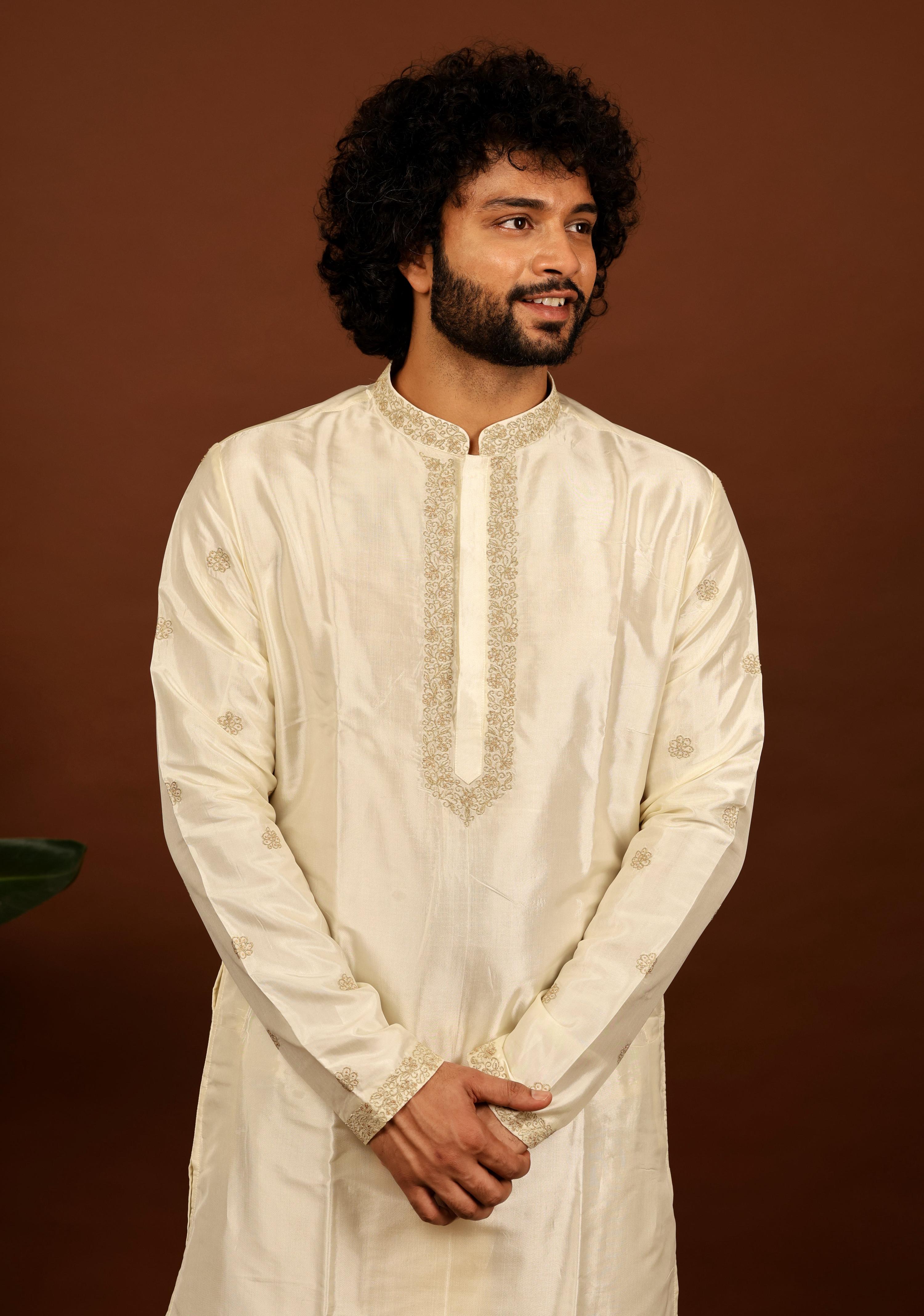 Off White Machine Embroidered Grandeur Pattu Kurta Set by Hilo Design - Distacart