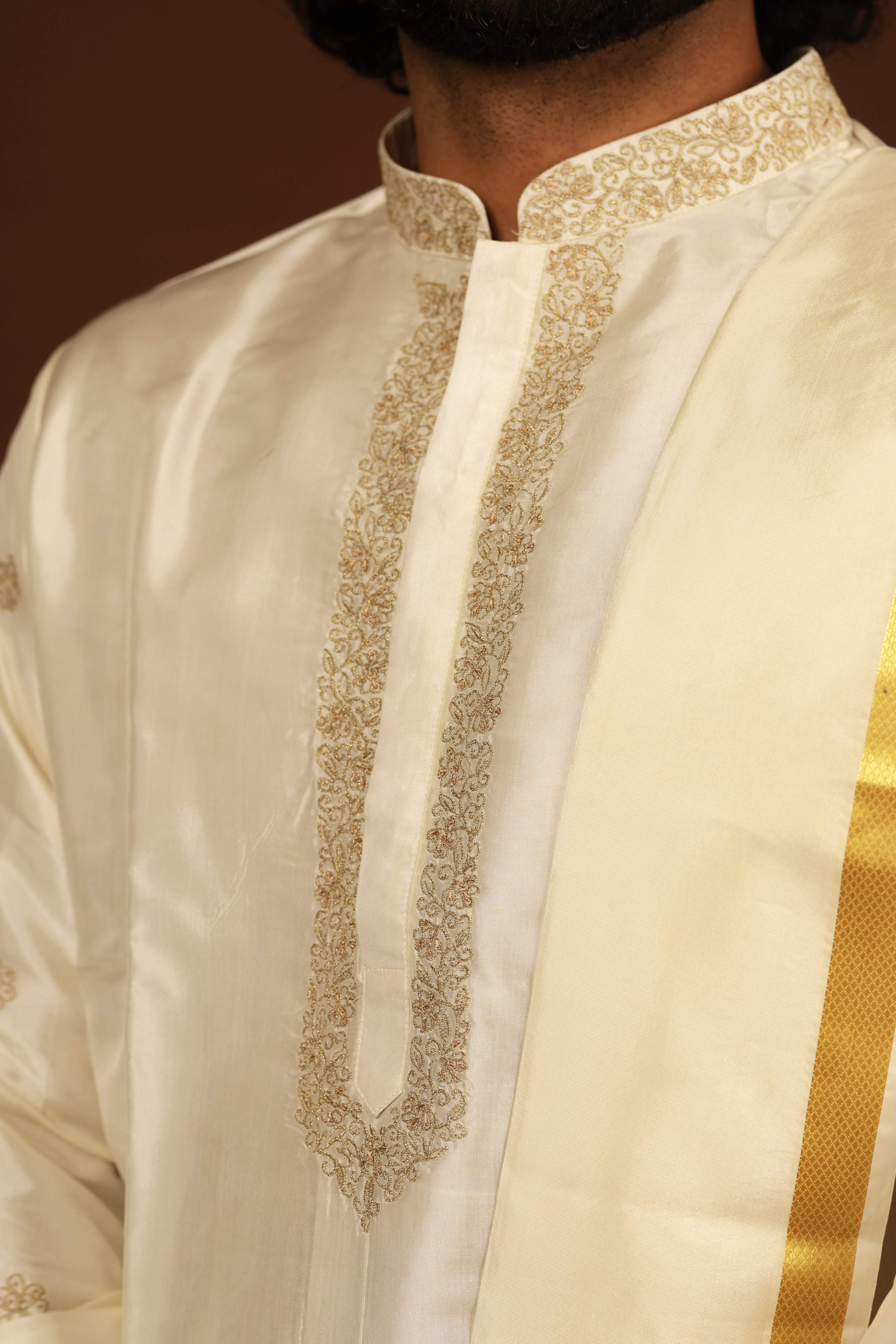 Off White Machine Embroidered Grandeur Pattu Kurta Set by Hilo Design