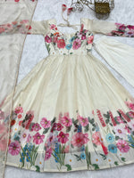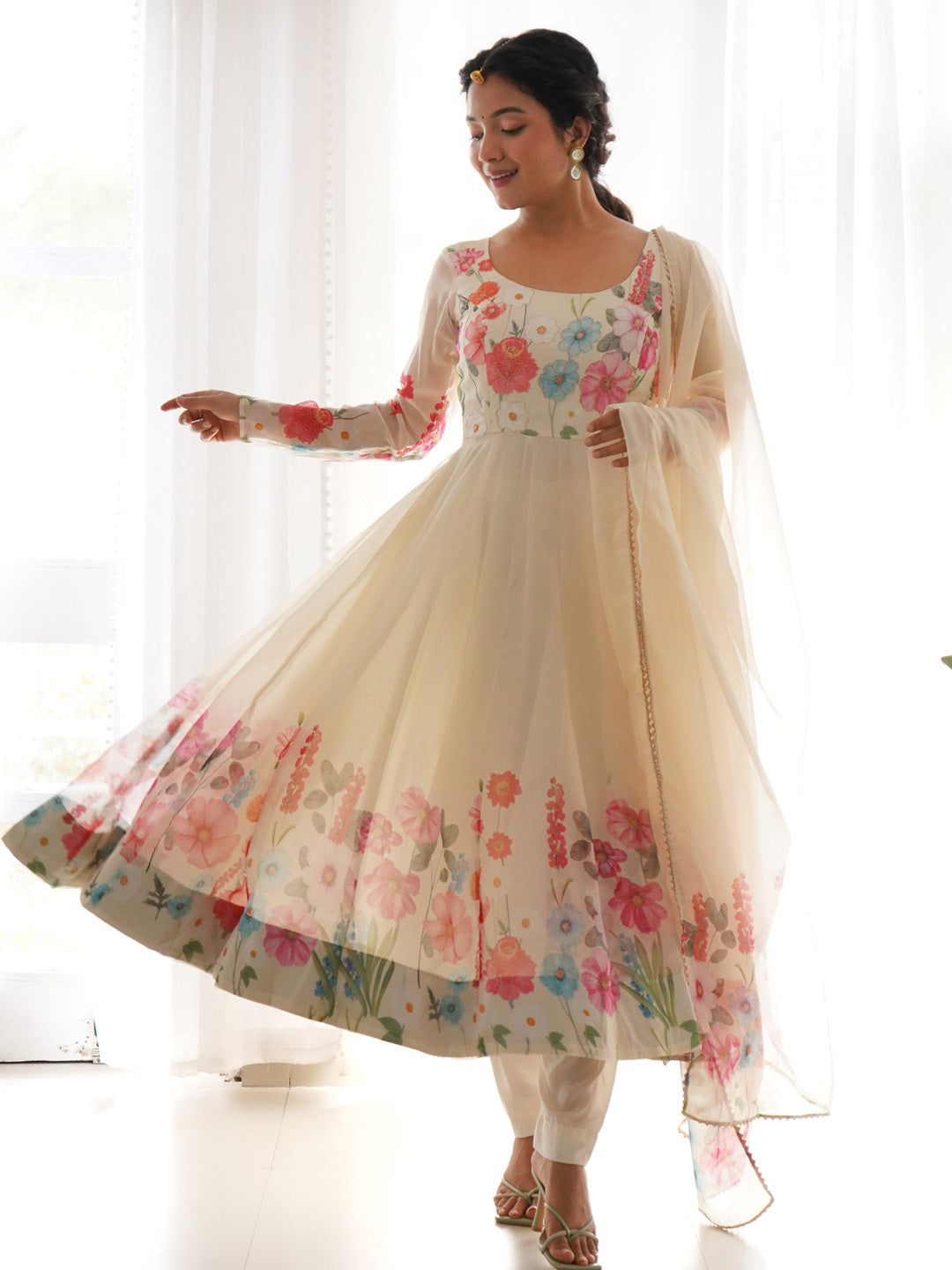 Evanik Cream Soft Organza Silk With Floral Print Fully Flared Anarkali Pant With Dupatta Set