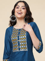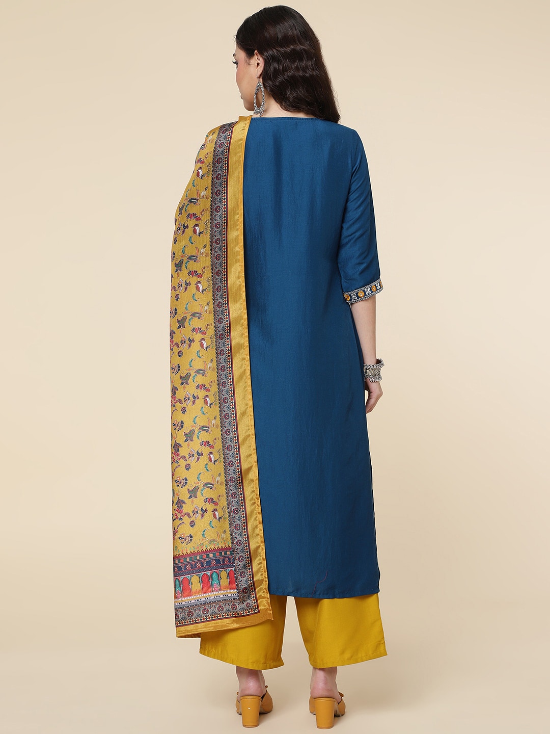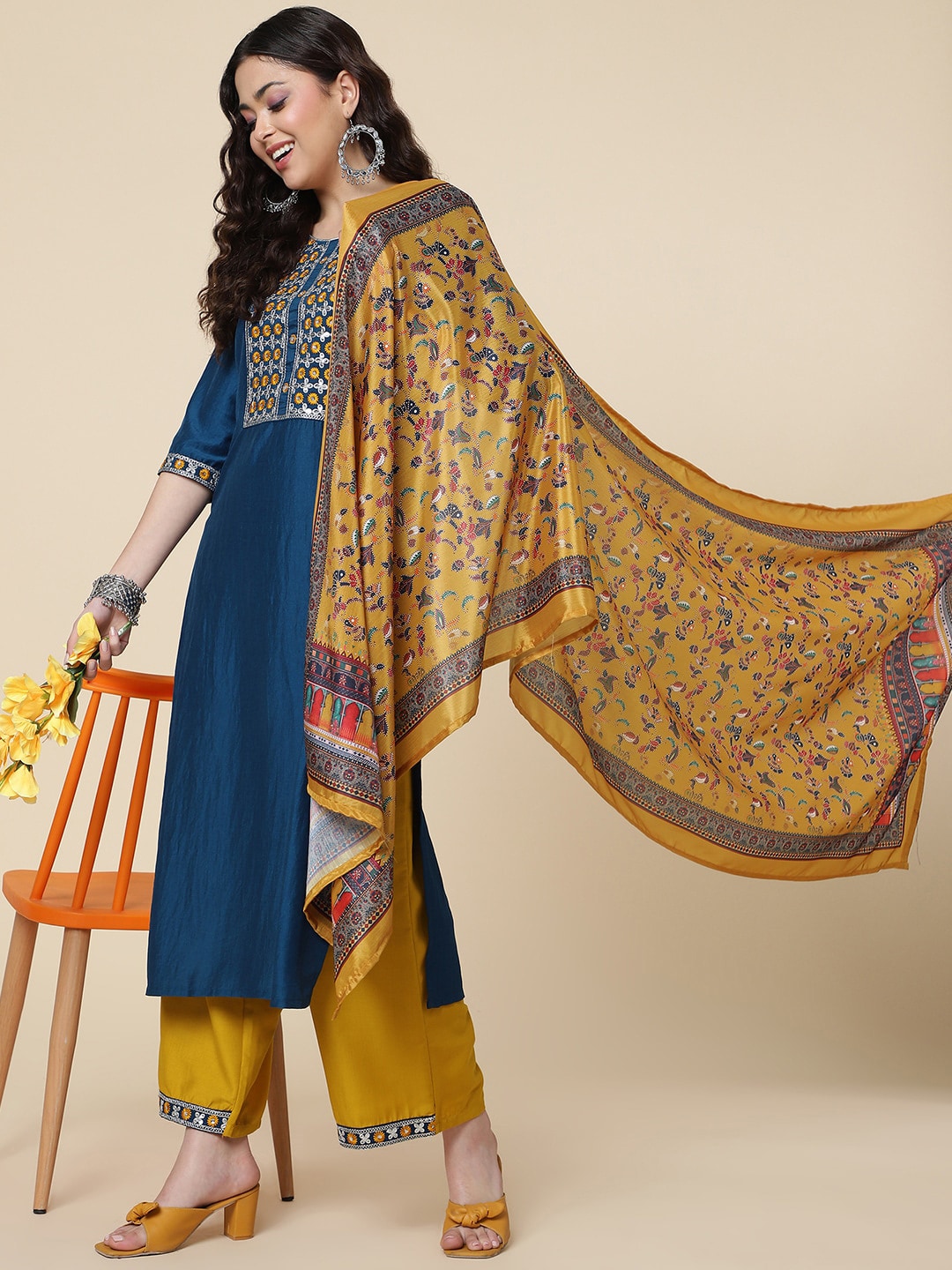 HERE&NOW Ethnic Motifs Embroidered Mirror Work Jute Silk Kurta with Trousers & Dupatta Product Details Navy blue and mustard yellow embr...