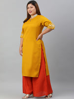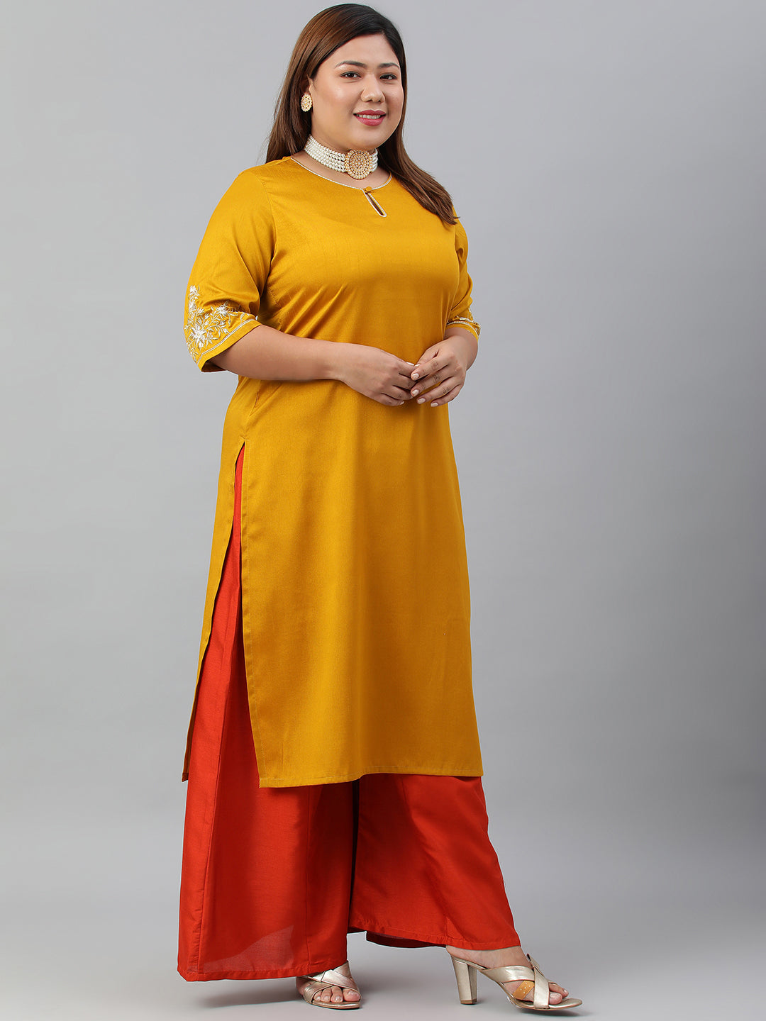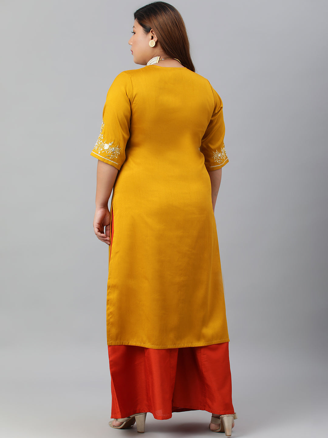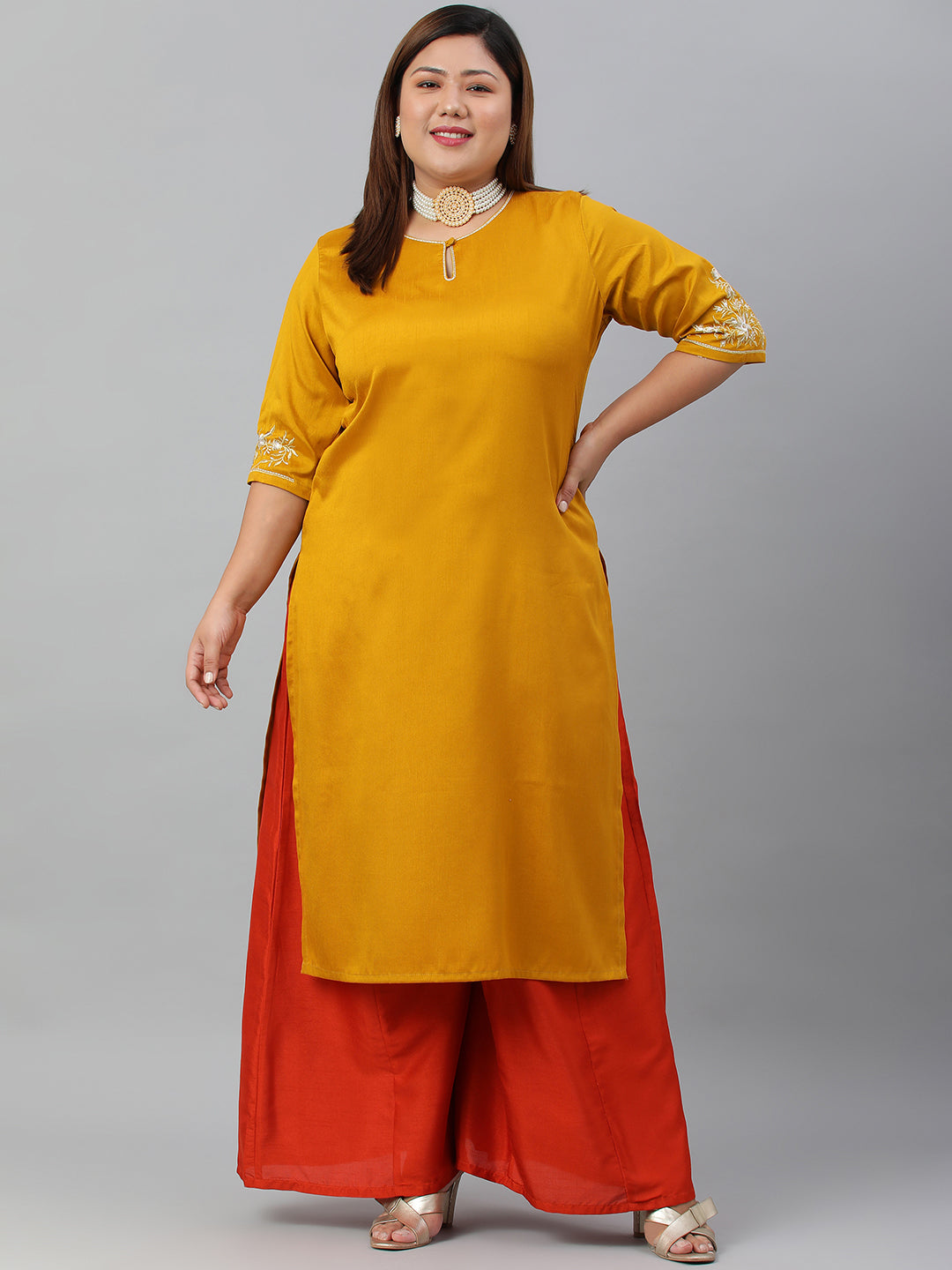 Janasya Women's Mustard Poly Silk Embroidered Festive & Party Straight kurta - Distacart