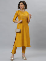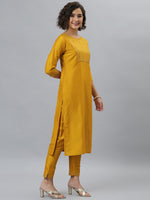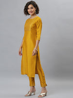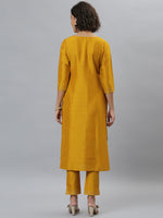 Janasya Women's Mustard Poly Silk Solid Straight Festive Kurta Set