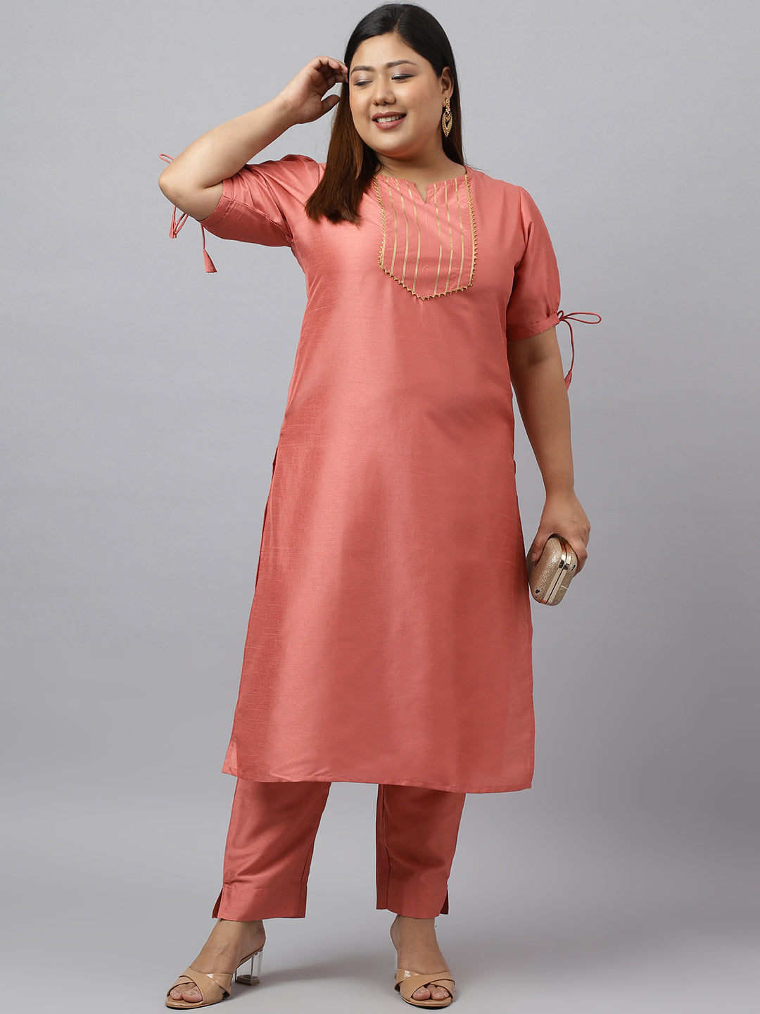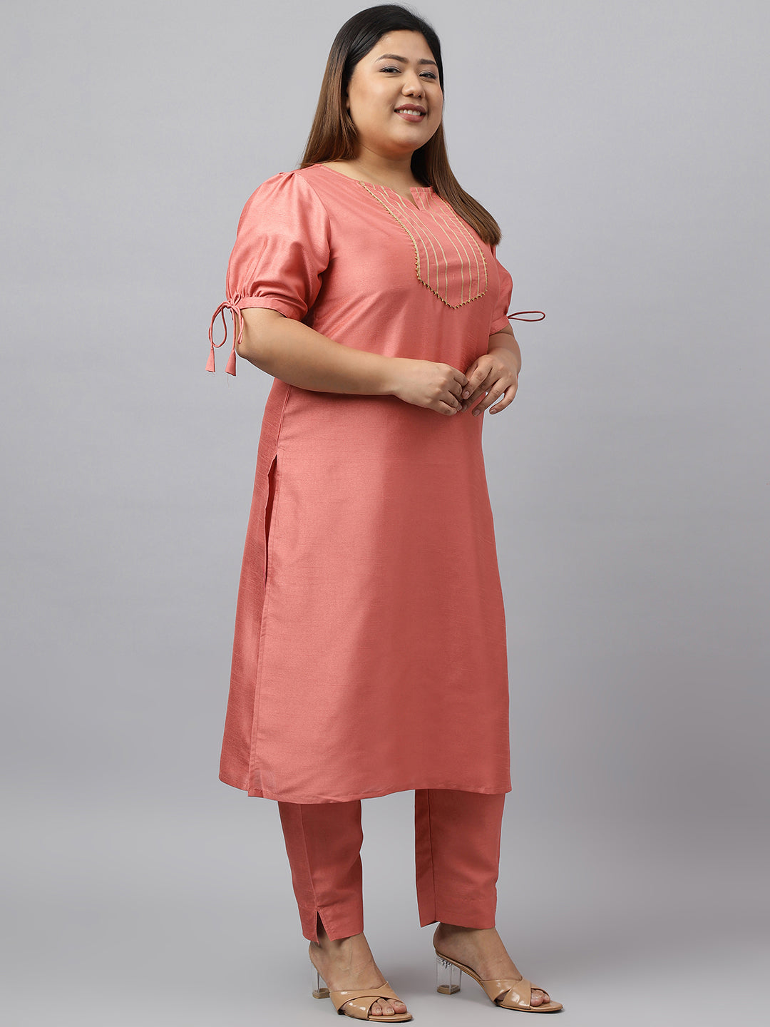 Janasya Women's Peach Poly Silk Straight Festive Kurta Set Color: Peach Fabric: Poly Silk Occasion: Festive Top Type: Kurta Top Style: St...
