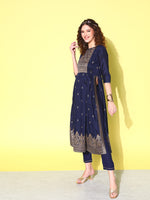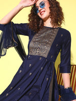 Sangria Floral Yoke Design Pleated Chanderi Silk Kurta with Trousers & With Dupatta Product Details Navy blue yoke design Kurta with Trouser...