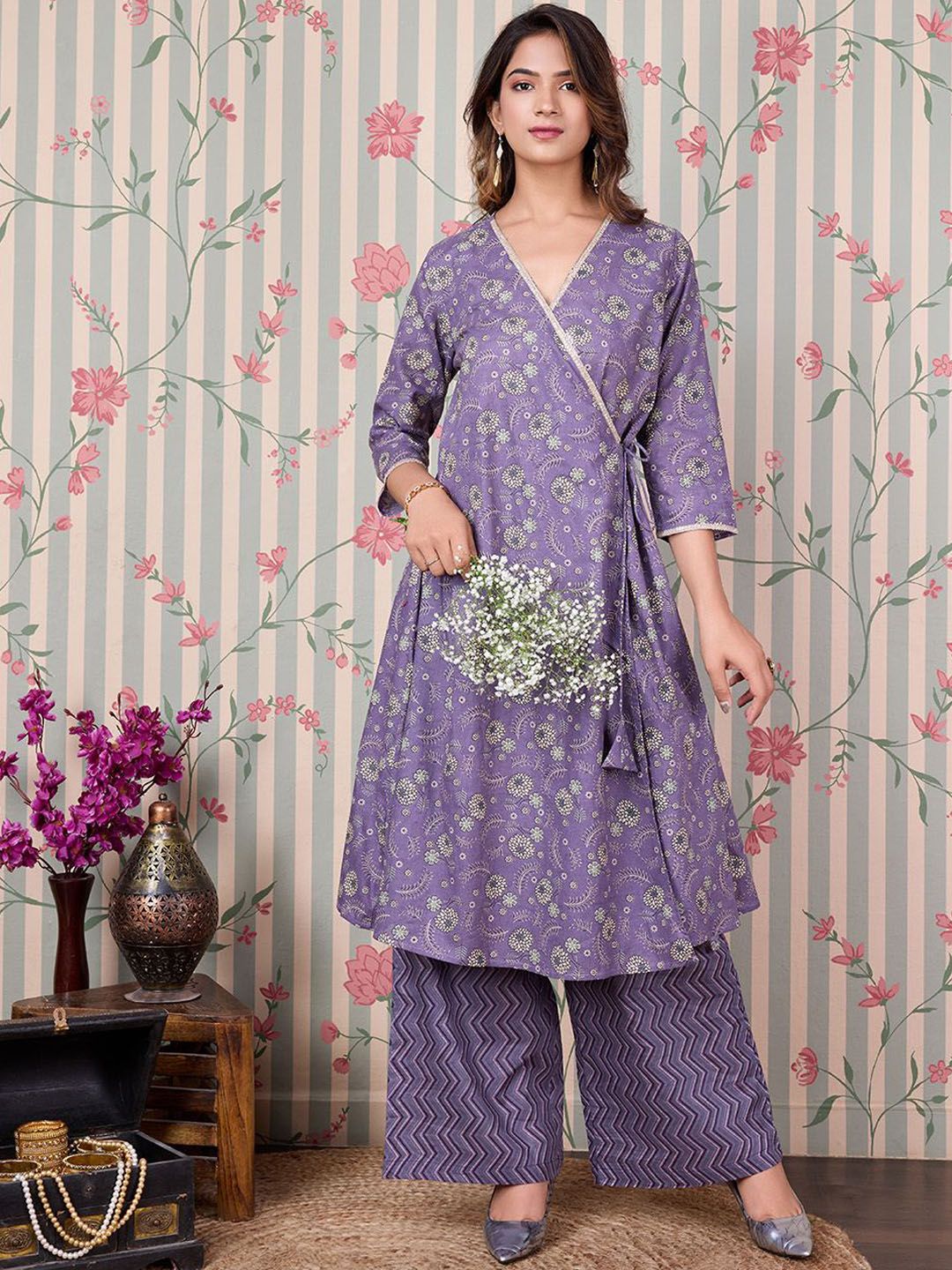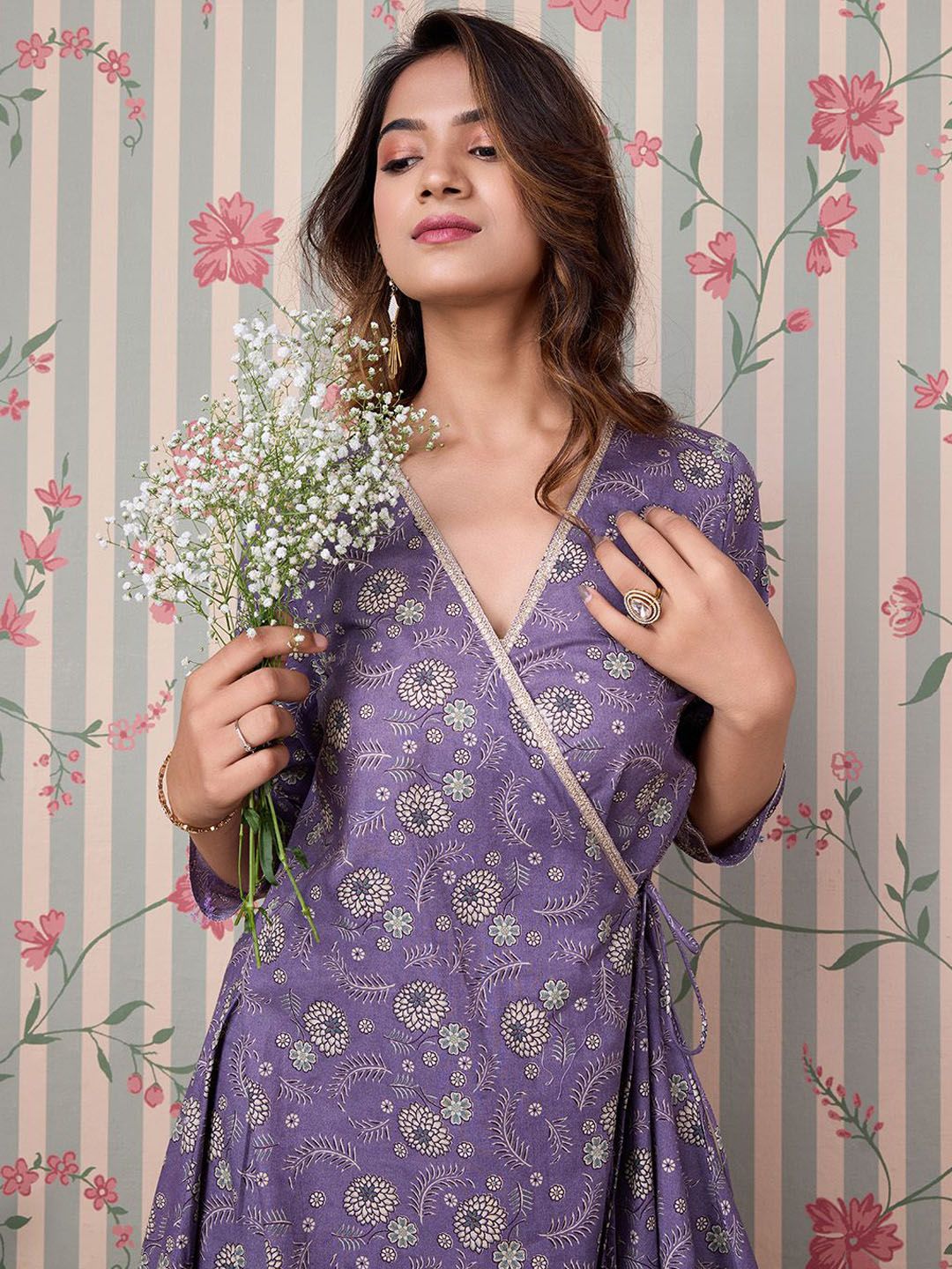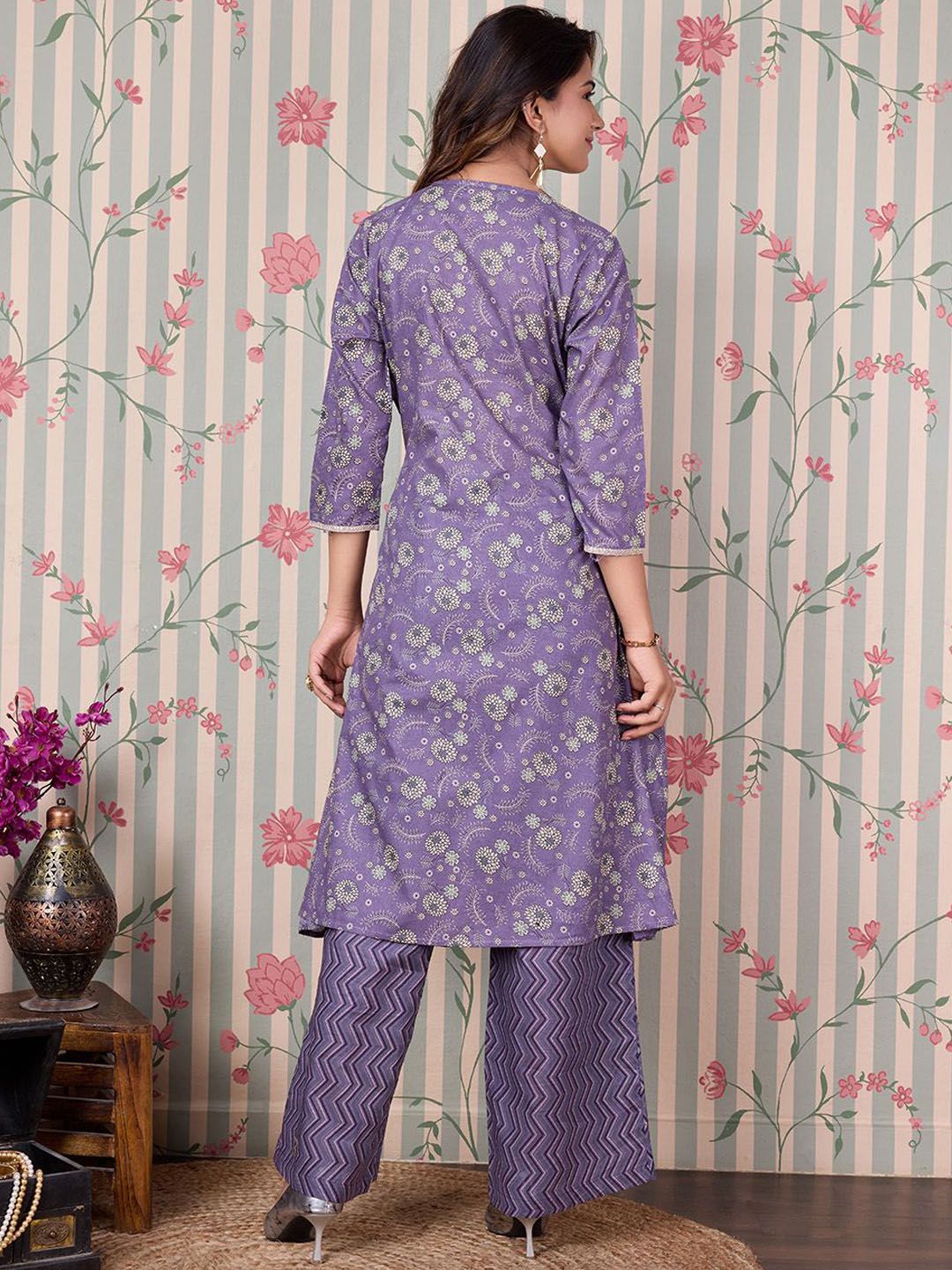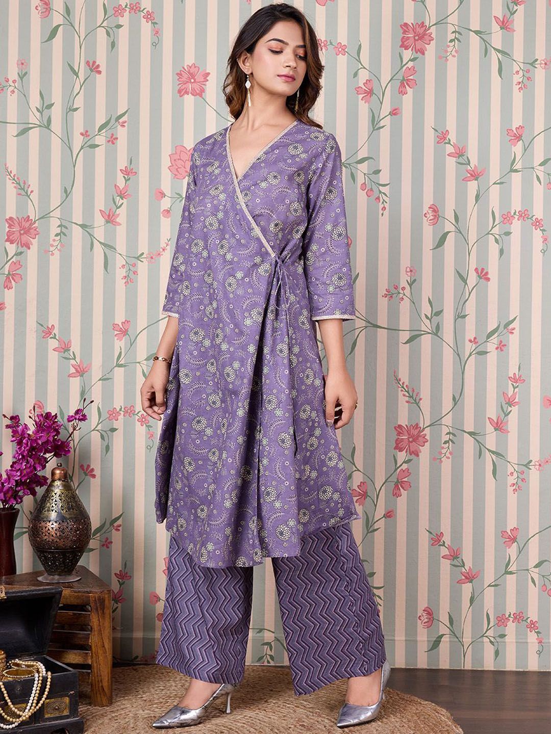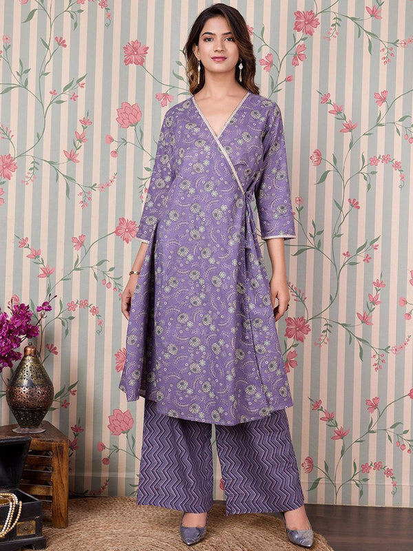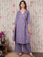 Ode by House of Pataudi Floral Printed Angrakha Gotta Patti Pure Cotton Kurta Set Product Details Purple & beige printed Kurta with Trousers...
