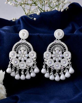 Jewels Nest Silver-Plated White Stone Chandelier Earrings with Floral and Beaded Detailing