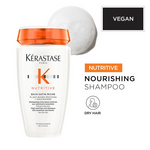 • Experience the ultimate nourishment for dry hair with Kerastase Nutritive Bain Satin Riche Shampoo. This deeply hydrating shampoo, enriched with anti-dryness polymers, gently cleanses while replenishing essential moisture to each strand. Its rich formula restores softness, smoothness, and shine, leaving hair feeling silky and manageable. Indulge in the luxurious lather and delightful scent of this nourishing shampoo for dry, sensitized hair.