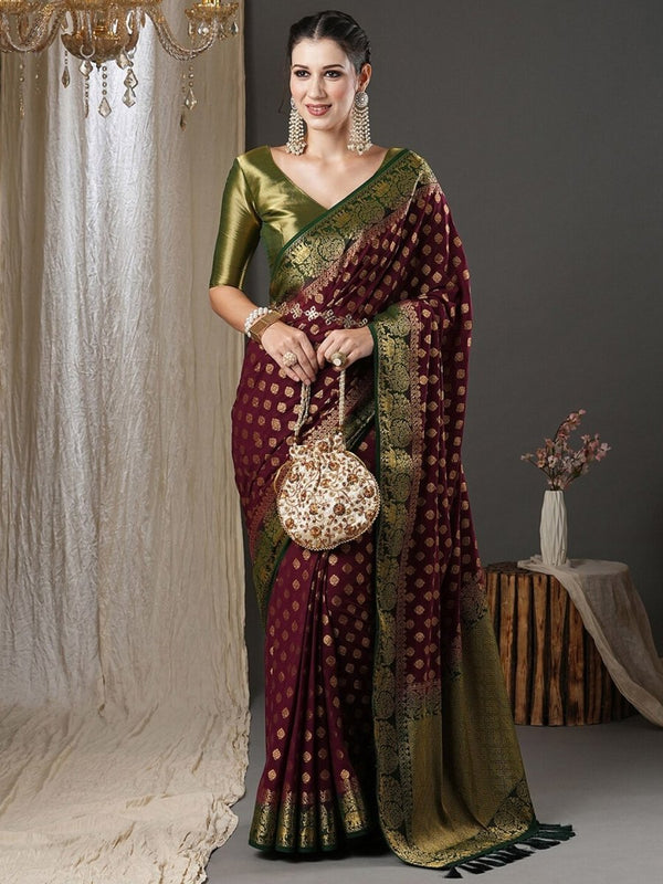 Anouk Burgundy & Green Ethnic Motifs Woven Design Zari Pure Georgette Kanjeevaram Saree - Distacart